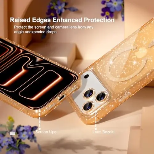 Package Includes: 1 x Glitter Magnetic Case Replacement for iPhone 17 Pro Max, 2 x tempered glass screen protectors, and 1 set of Camera Lens Protectors.Only Compatible with iPhone 17 pro max 6.9-inch 2025. Please check your phone model and make sure you order the right size Strong Magnetic Power: This compatible Mag-Safe iPhone 17 pro max case provides powerful built-in magnets with 1500g of holding force enabling faster, easier place-and-go wireless charging and a secure lock on any Mag-Safe accessory Militarty Grade Drop Protection: Made of quality hard PC back and soft tpu frame which is durable. Slim Fit tightly to the phone body, doesn't make your iphone 17 pro max phone case too bulky. Feels soft and easy to hold, offering enough grip for women and girls Full Glitter Design: Both the back and the side frame are full of glitter and come with a set shiny diamond camera lens protective cover, making your 17 pro max more feminine and bringing more compliments Screen and Camera Protection: Raised edge lip provide extra protection for your iPhone screen and camera from scratches and dirt when your iPhone is dropped accidentally. The glitter camera protectors not only protect the lens but also personalized decorations.