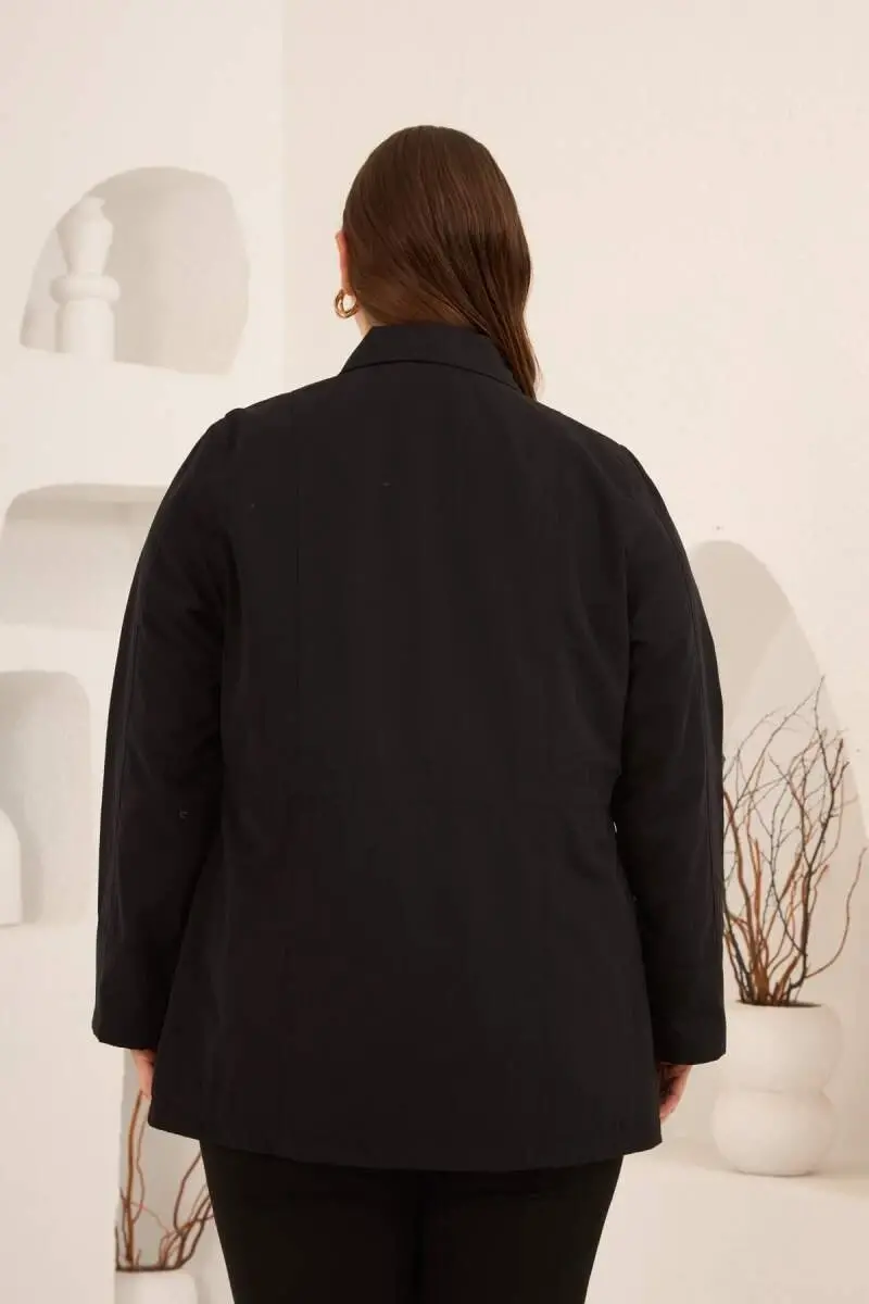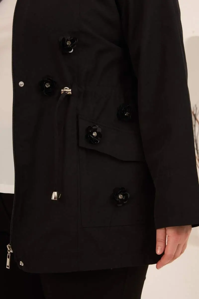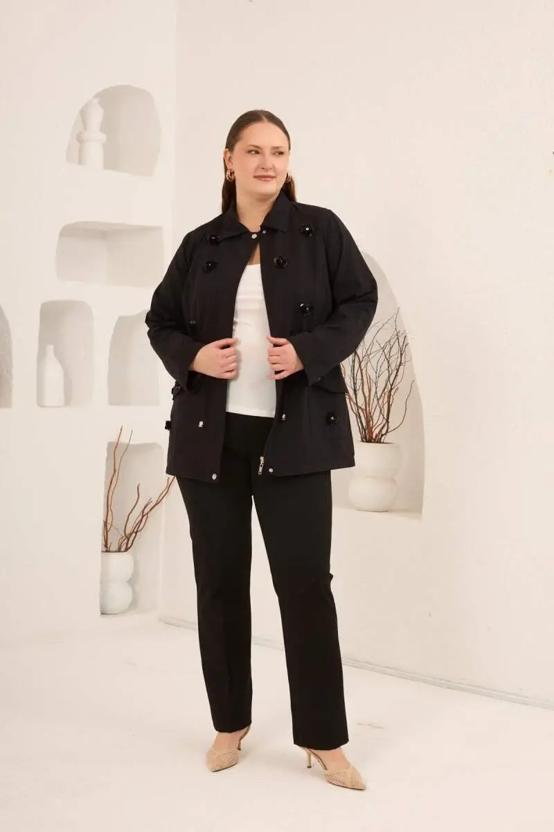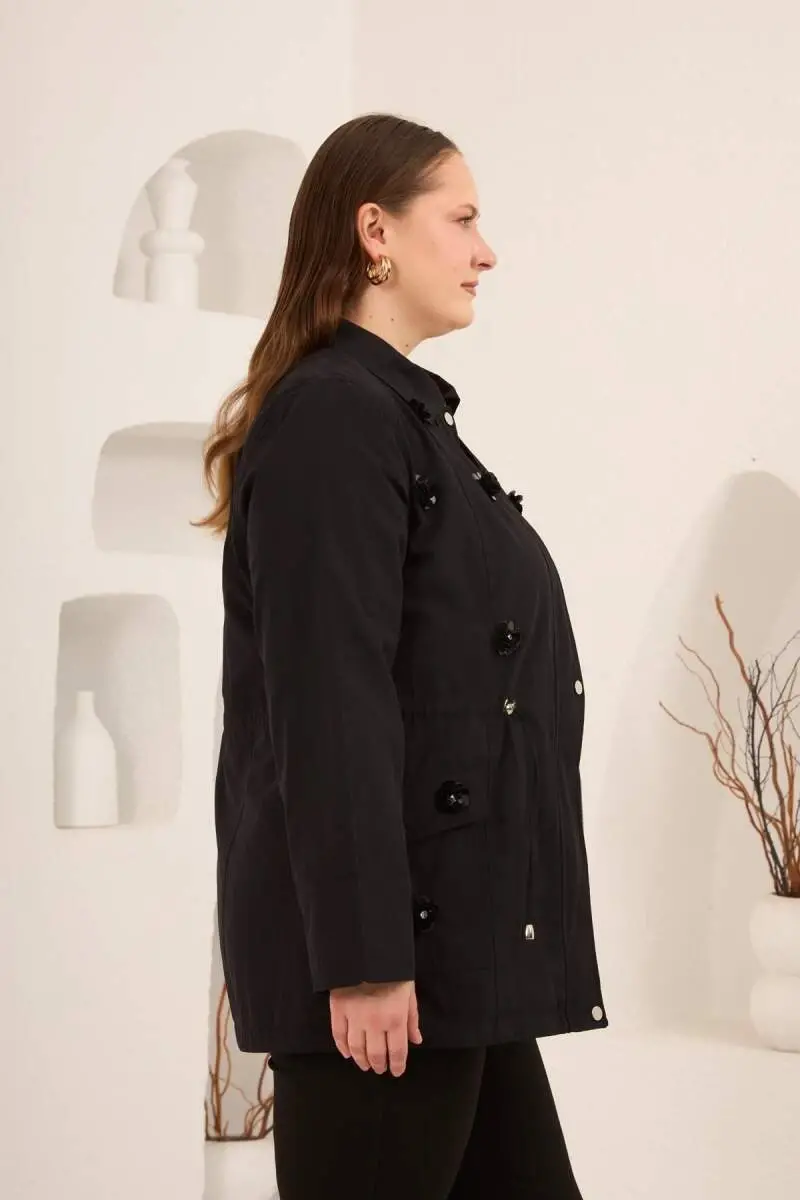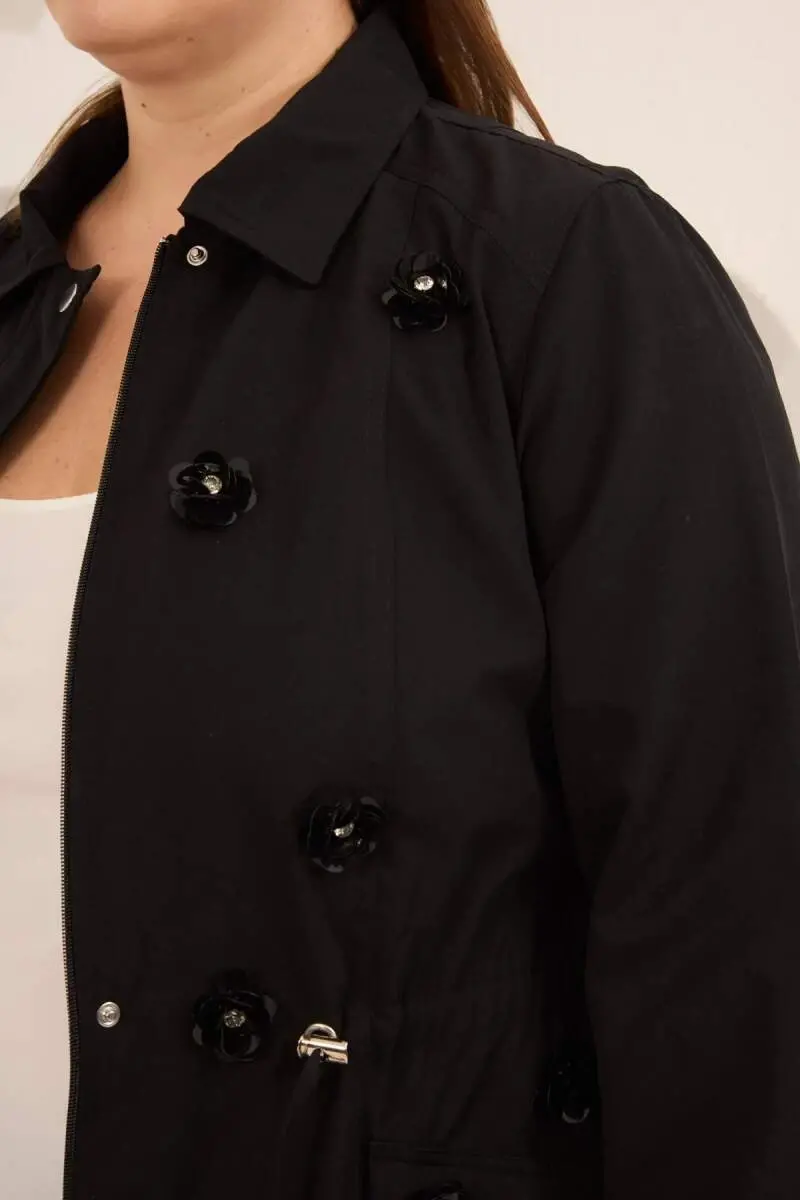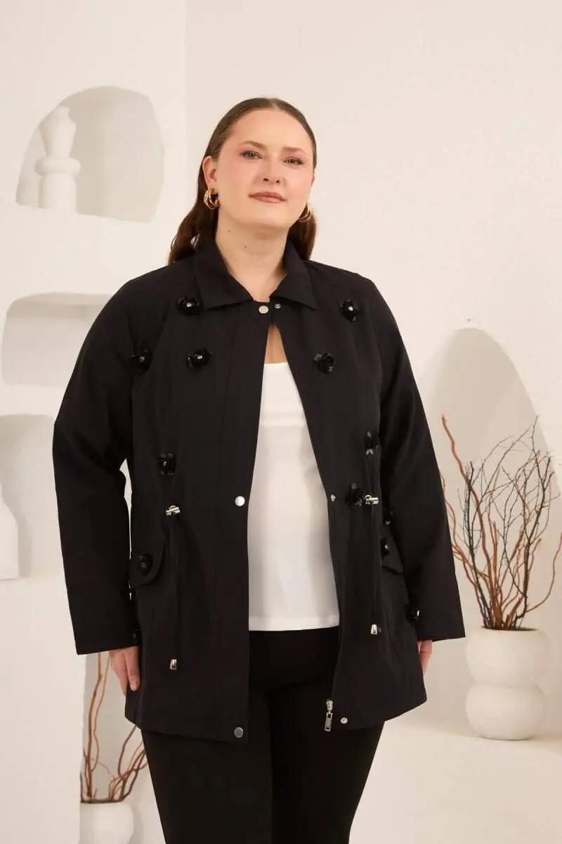Çiçek Aplikeli Kadın Büyük Beden Trençkot Siyah