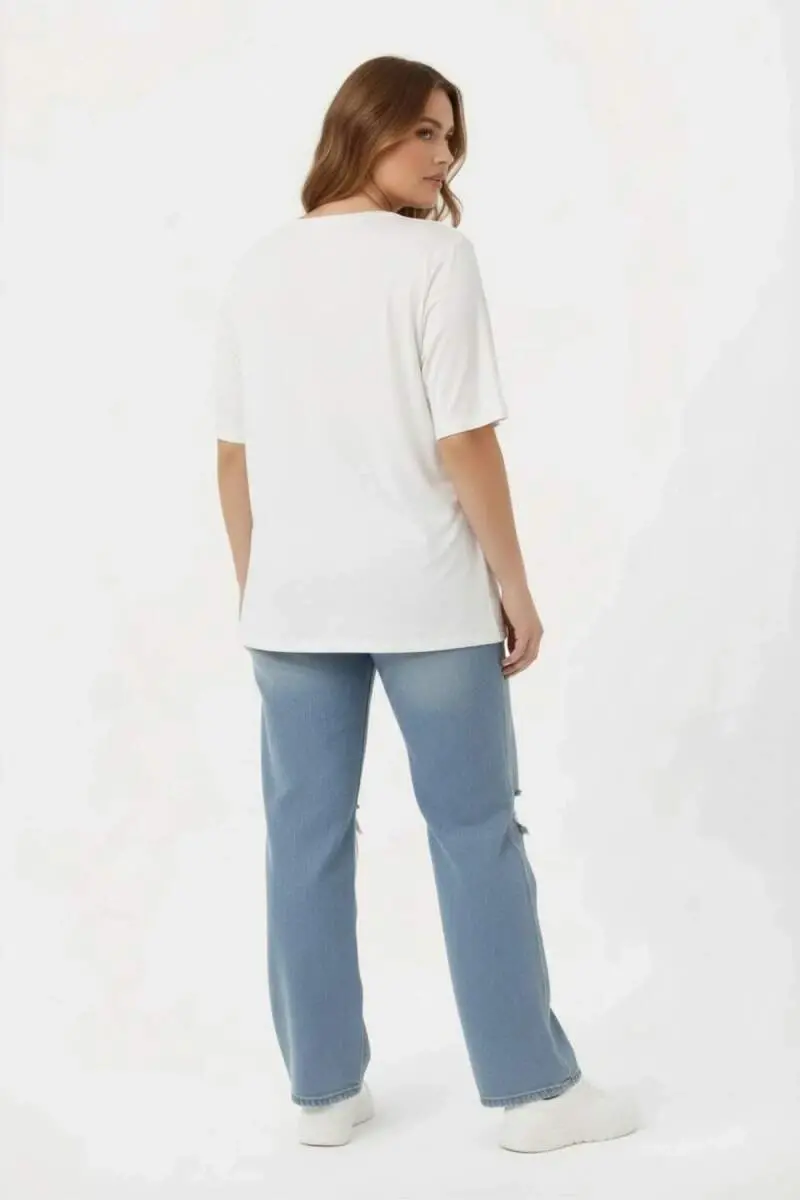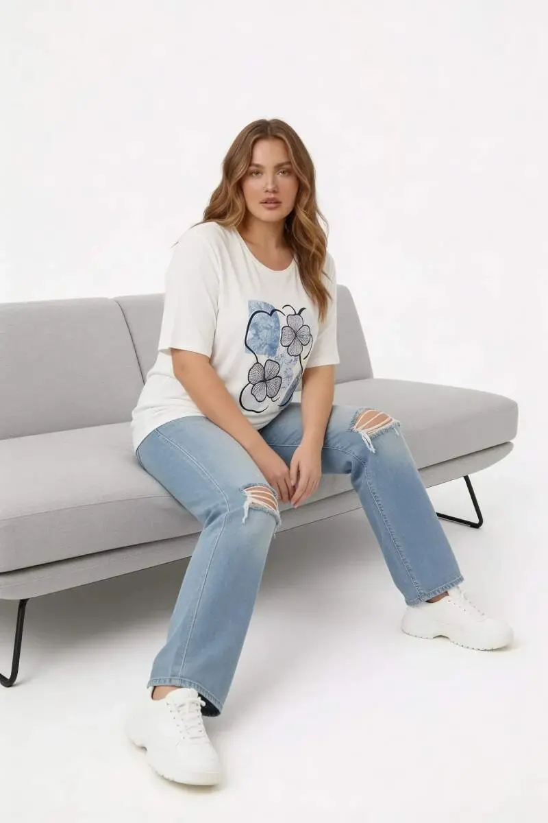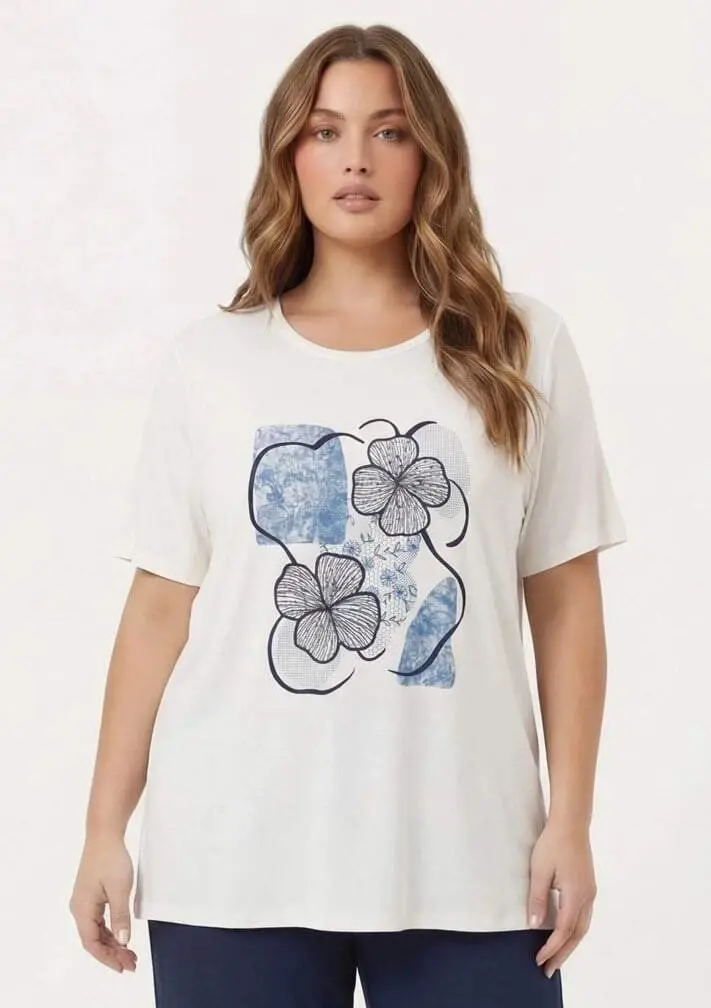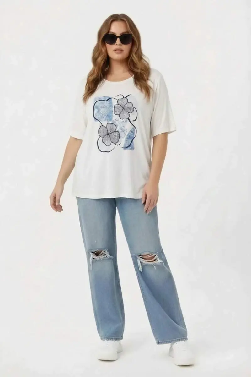 Çiçek Baskılı Kadın Büyük Beden Tişört Ekru