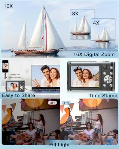 Разжигайте творческий потенциал вашего ребенка и его страсть к запечатлению воспоминаний! Эта 4K цифровая камера — идеальный подарок для детей. Она оснащена передними и задними двойными объективами, разрешением 48 МП, картой памяти на 32 ГБ и двумя батареями. 16-кратный цифровой зум позволяет легко захватывать даже далекие объекты.