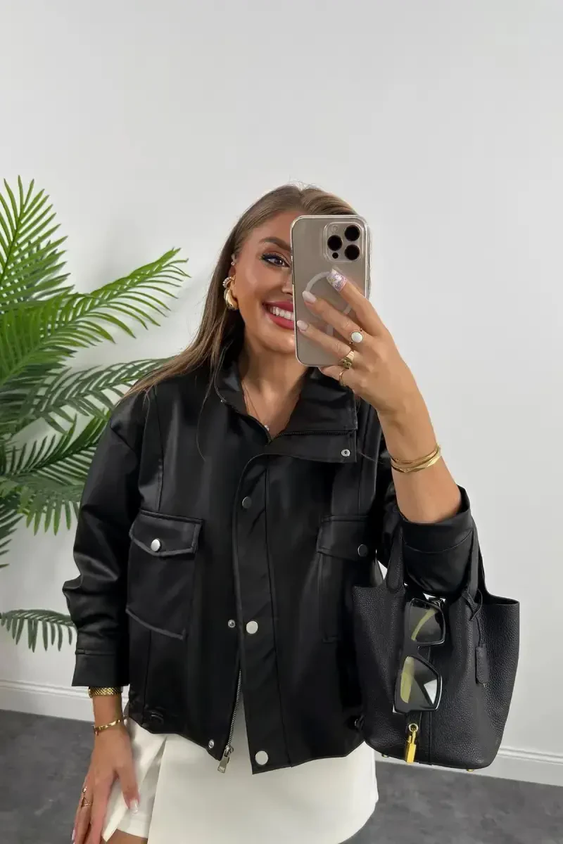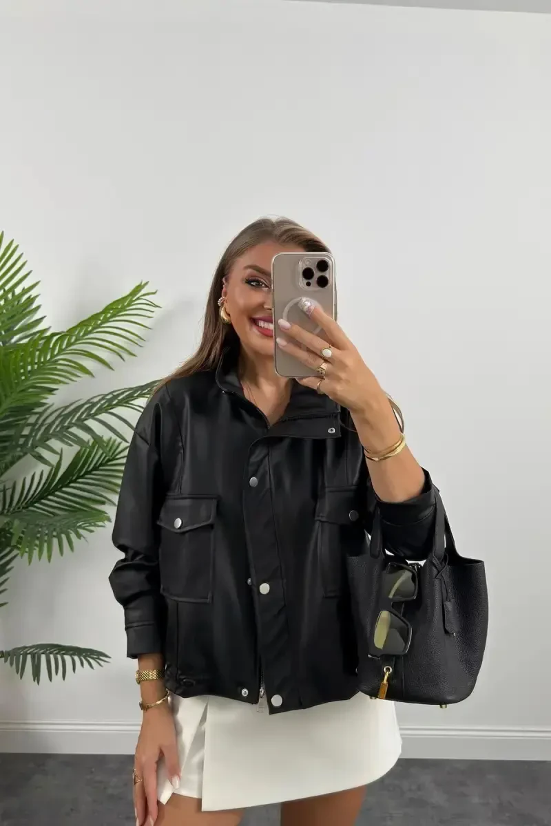 Kalite ve şıklığı bir arada arayanlar için mükemmel bir seçim olan Çift Cep Yan Büzgülü Deri Ceket, gardırobunuzun olmazsa olmaz parçalarından biri olacak.