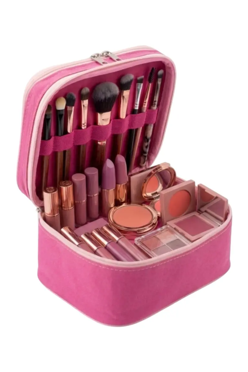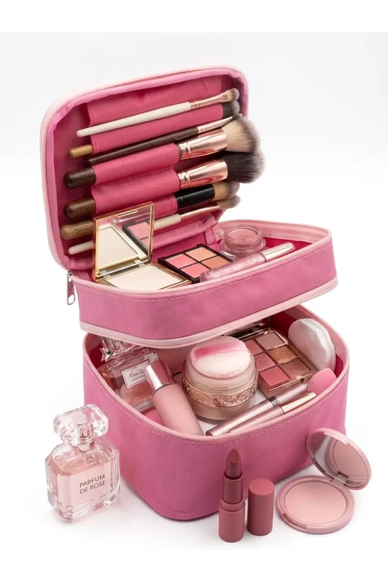 Bu ürün NAMLI ÇANTA tarafından gönderilecektir.Kampanya fiyatından satılmak üzere 50 adetten fazla stok sunulmuştur.Bir ürün, birden fazla satıcı tarafından satılabilir. Birden fazla satıcı tarafından satışa sunulan ürünlerin satıcıları ürün için belirledikleri fiyata, satıcı puanlarına, teslimat statülerine, ürünlerdeki promosyonlara, kargonun bedava olup olmamasına ve ürünlerin hızlı teslimat ile teslim edilip edilememesine, ürünlerin stok ve kategorileri bilgilerine göre sıralanmaktadır.Bu üründen en fazla 7 adet sipariş verilebilir. 7 adedin üzerindeki siparişleri Trendyol iptal etme hakkını saklı tutar. Belirlenen bu limit kurumsal siparişlerde geçerli olmayıp, kurumsal siparişler için farklı limitler belirlenebilmektedir.15 gün içinde ücretsiz iade. Detaylı bilgi için [page="return_conditions"]tıklayın .- Çift katlı tasarımı sayesinde geniş iç hacmiyle makyaj malzemelerinizi düzenli ve kolay erişilebilir bir şekilde saklamanızı sağlar.- Büyük boy yapısı, tüm kozmetik ürünlerinizi rahatça sığdırabileceğiniz ideal bir depolama alanı sunar.- Fonksiyonel yapısı ile seyahatlerinizde ihtiyacınız olan her şeyi yanınızda taşımanızı kolaylaştırır.- Fuşya rengi ve çok renkli detayları ile şık ve modern bir görünüm sunar.- Türkiye'de üretilmiştir, yerel üretim desteklenir.