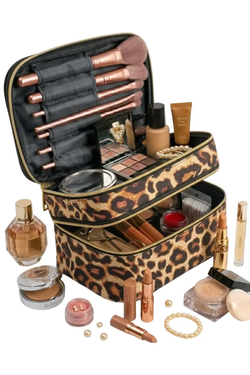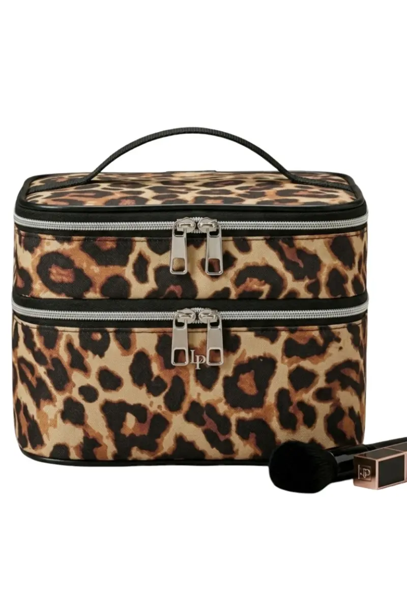 Çift Katlı Captain Seyahat Makyaj Çantası - Büyük Boy Fonksiyonlu Kozmetik Düzenleyici Leopar-Leopar