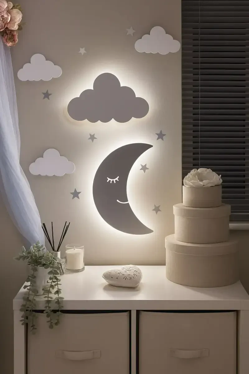 Приготовьтесь превратить комнату вашего ребенка в волшебную атмосферу! Этот очаровательный деревянный ночник в виде луны и облака с его мягким и теплым LED освещением поможет вашему ребенку спокойно заснуть. Днем он станет потрясающим украшением вашей комнаты, добавив ей изысканности.