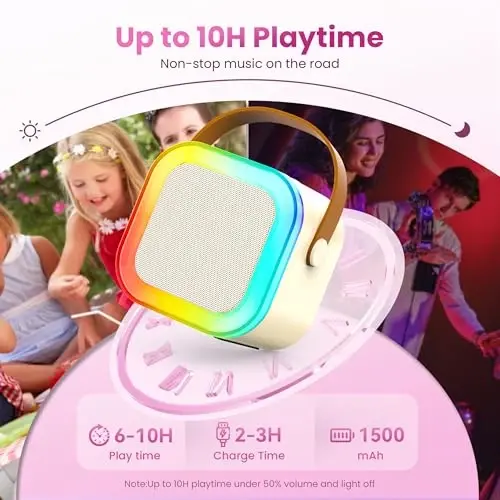 【 ASTONISHING SOUND】: The mini portable karaoke machine has a built-in professional tuning grade speaker, and the breathtaking stereo sound with exceptional clarity and zero distortion by the high-sensitivity drivers,perfect for home parties and outdoor events. 【6-10H WORRY-FREE BATTERY LIFE】: Peski's exclusive, long-life rechargeable battery technology. Quicker charging,and it can doubles as a power bank to charge your smartphone/tablet, long-time lasting design in order to make it easy to bring the party with you wherever you go,perfect for parties and family gatherings! 【BLUETOOTH 5.0 TWS TECHNOLOGY】: This bluetooth karaoke speaker for kids and adults with 2 microphones that automatically connect to each other, adopts new bluetooth 5.0 technology ensures instant pairing, providing stable transmission and 50ft long-distance without obstacles.this karaoke machine supports TF card, USB, and AUX input connections and is compatible with Android devices, TVs, iPads, tablets,car karaoke,and PCs. 【5 MAGIC VOICE & COLORFUL LIGHTS】: The PA karaoke system is equipped with colorful disco lights and has an independent button to switch the lights.5 magic voice effects: monster, baby, female, male,original/accompaniment,this Bluetooth party speaker is providing endless fun and happiness for adults and kids. 【Perfect Gift Ideas for Kids and Adults】: This mini karaoke machine is an ideal gift for birthdays,parties,gatherings,teen girls boys 8-12 years, ages 3, 4, 5, 6, 7, 8, 9, 10, 11, 12+ years old.Great gifts choices for Halloween,Christmas,Easter,Valentine,Thanksgiving,New Year 【LIGHTWIGHT & EASY TO OPERATE】: This portable bluetooth speaker with small size, it's so easy to carry,and wherever you go, you can easily take the mini karaoke machine ! It is perfect for family and children's parties, birthday, family gatherings, outdoors, trips, classrooms, and any event.We provide every customer with a LIFETIME AFTERSALES and NO REASON REPLACEMENT service! If you have any issues during using the singing machine,we are available to assist you and will resolve any issues within 24 hours.
