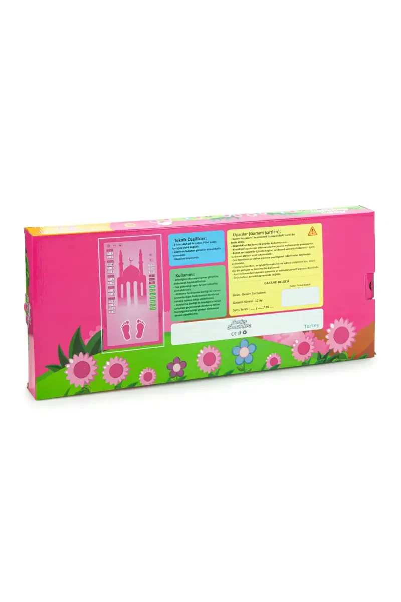 Kichkina farzandlaringizning namoz bilan tanishishi va ibodatlarini zavq bilan bajarishi uchun mo'ljallangan Mening Namoz Gilamim, 7 xil tilda ovozli yo'l-yo'riq bilan farzandlaringizning namozni o'rganish jarayonini osonlashtiradi. Pushti rangi va yoqimli dizayni bilan Mening Namoz Gilamim farzandlaringizning e'tiborini tortadi, shu bilan birga duo va zikr tovushlari ularni tinch ibodat muhitiga olib boradi.