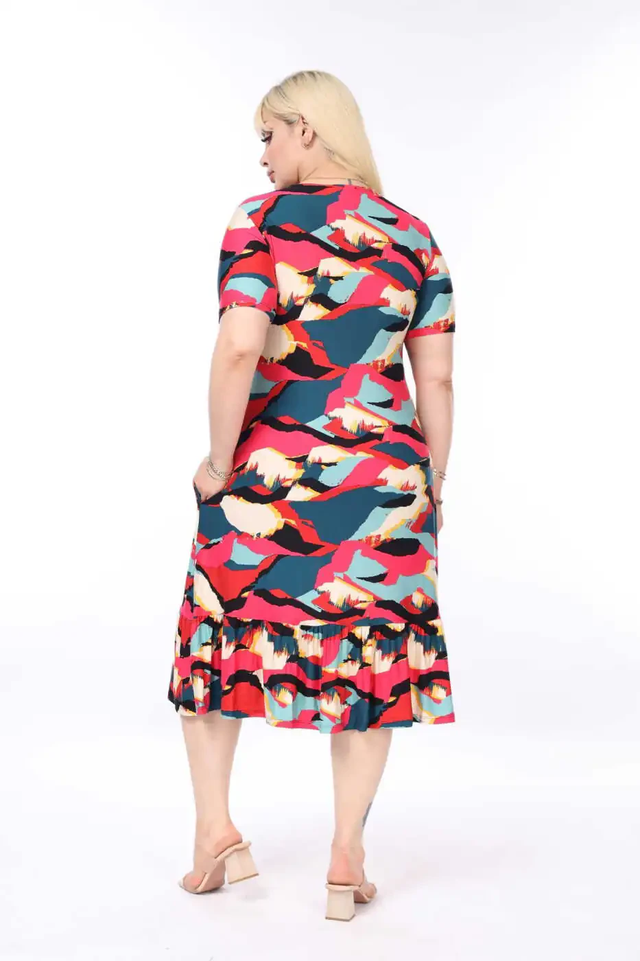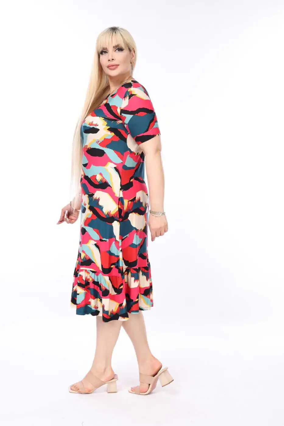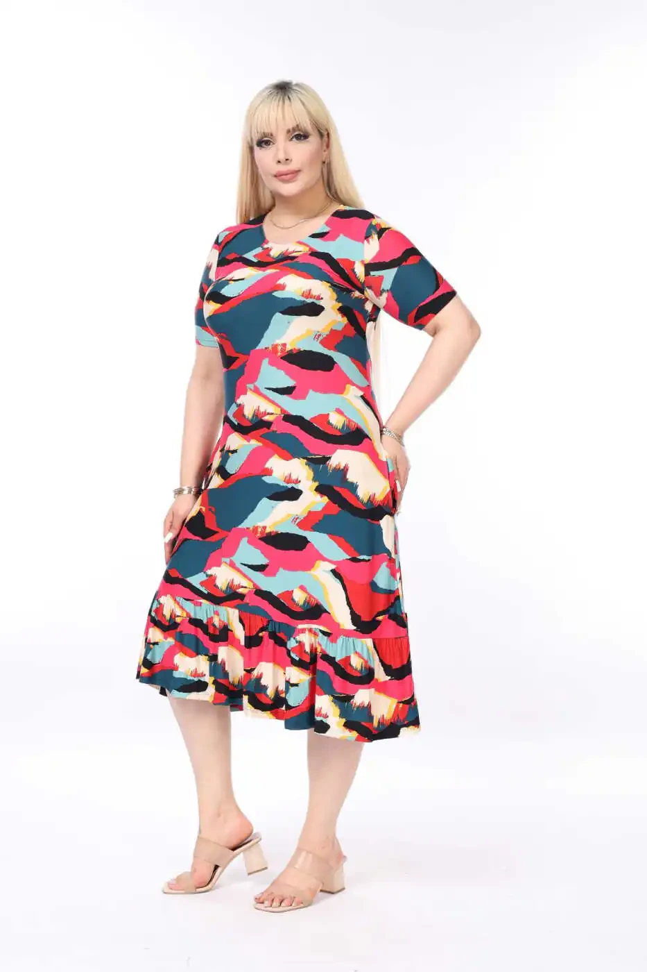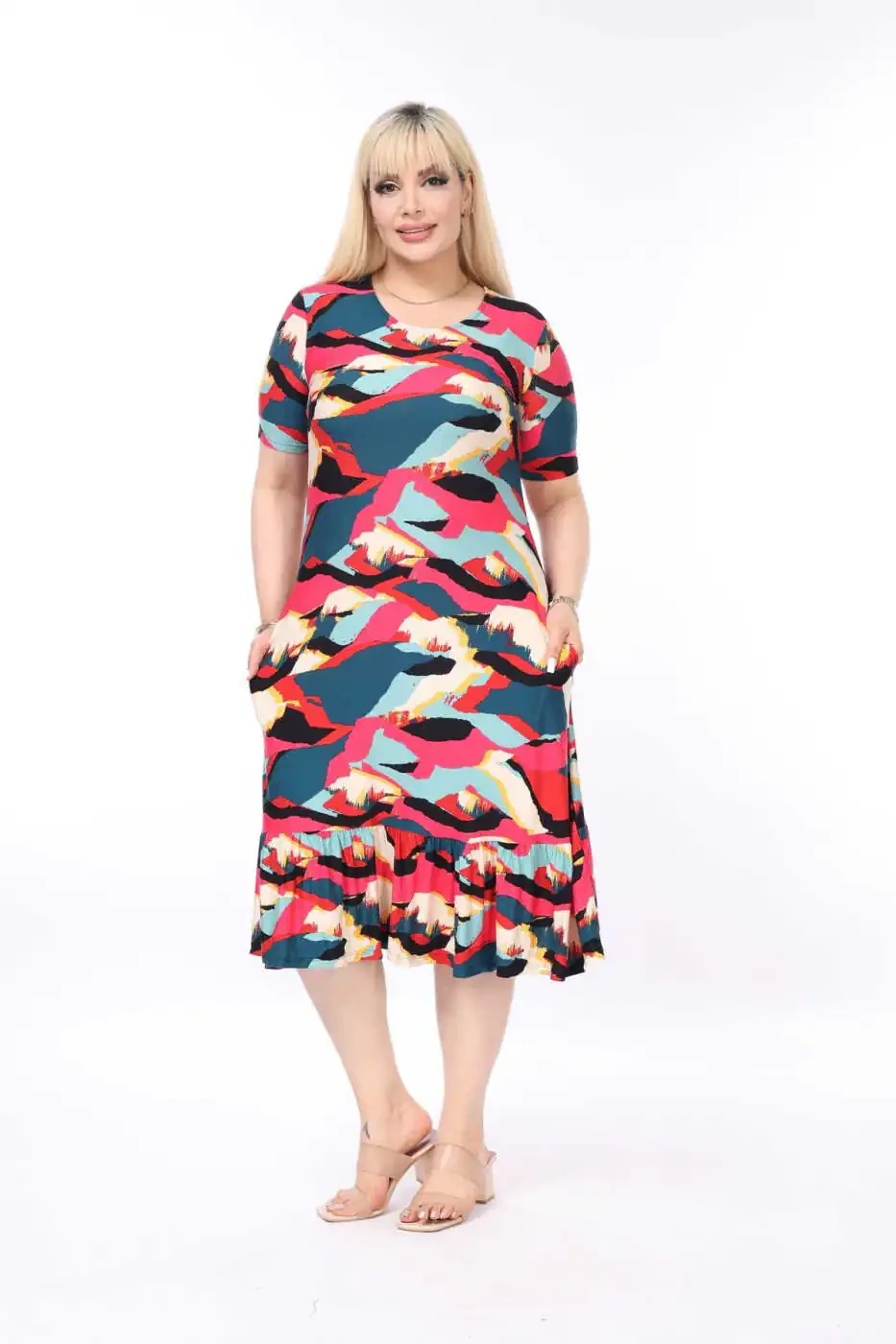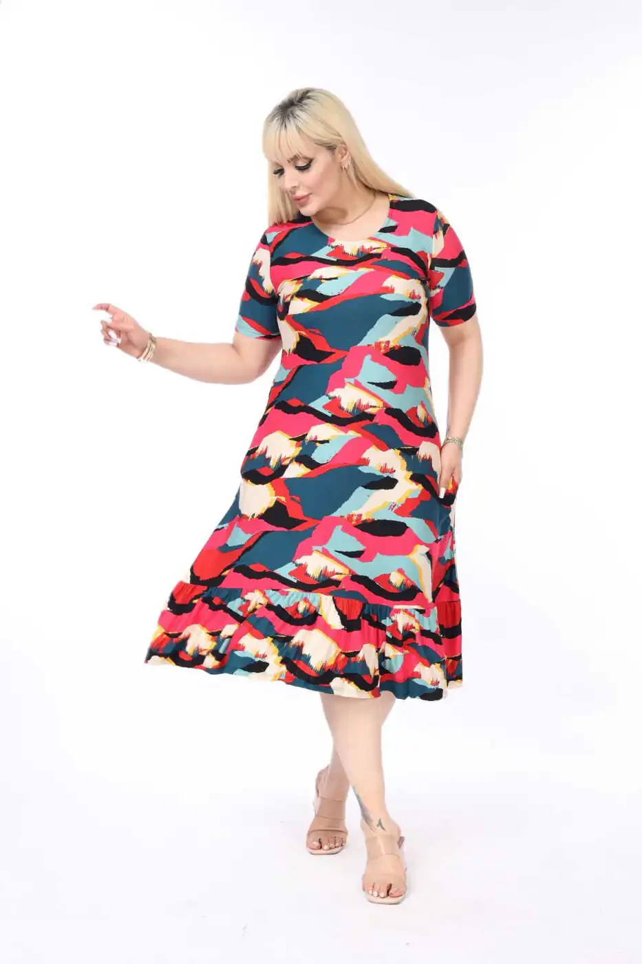 Выразите свой стиль с помощью этого платья, которое сочетает в себе элегантность и комфорт! Многоцветная юбка делает платье выделяющимся, а воланы добавляют женственности. Платье предлагает размеры plus size, чтобы подойти любой фигуре, его свободный крой обеспечивает комфорт на протяжении всего дня. Платье также предлагает практичность благодаря своим карманам, а с различными вариантами цветов оно может адаптироваться к любому стилю.
