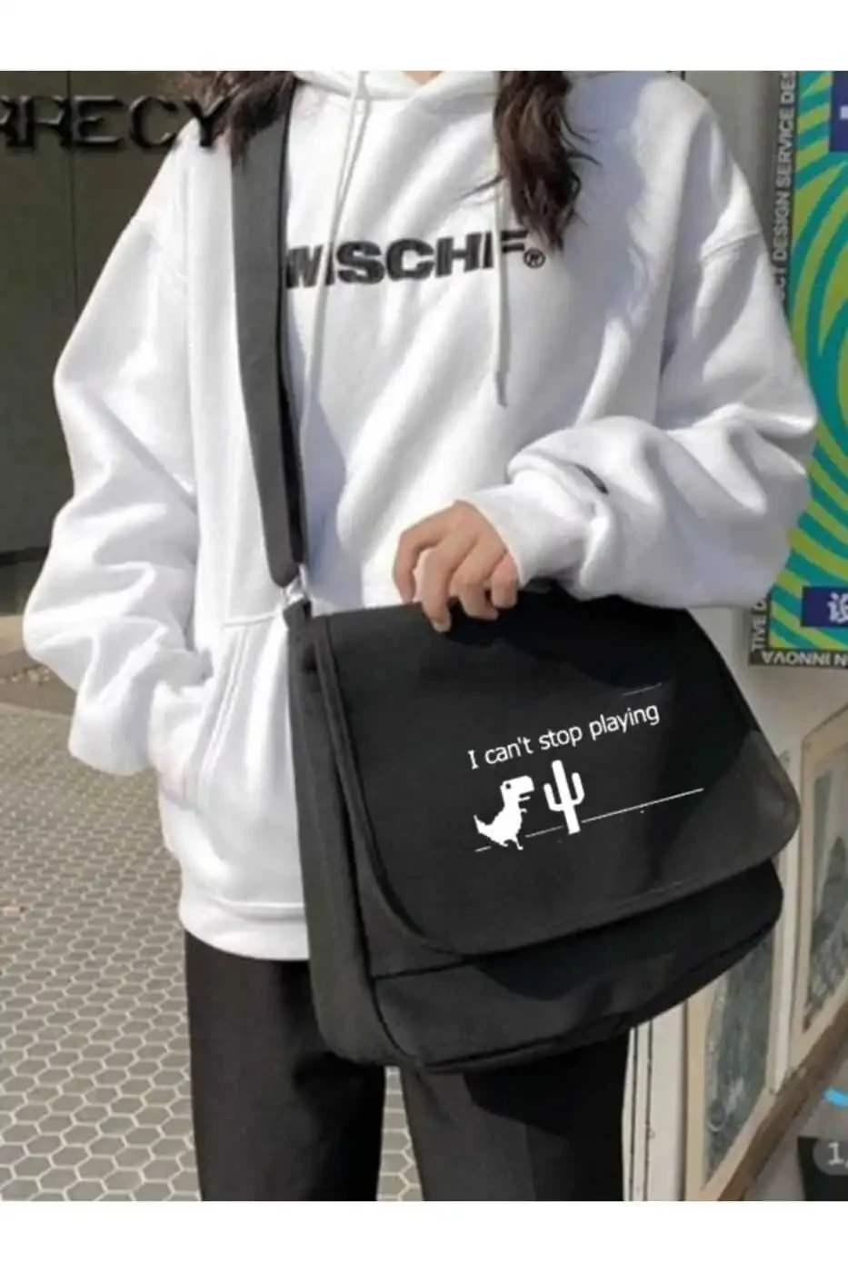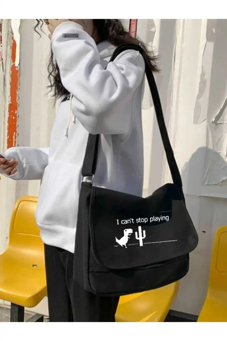 Унисекс черная сумка-почтальон с принтом Very Kind Dinosaur Game разработана так, чтобы дополнять как спортивные, так и элегантные наряды. Принт добавляет яркий и веселый вид, еще больше подчеркивая ваш стиль.