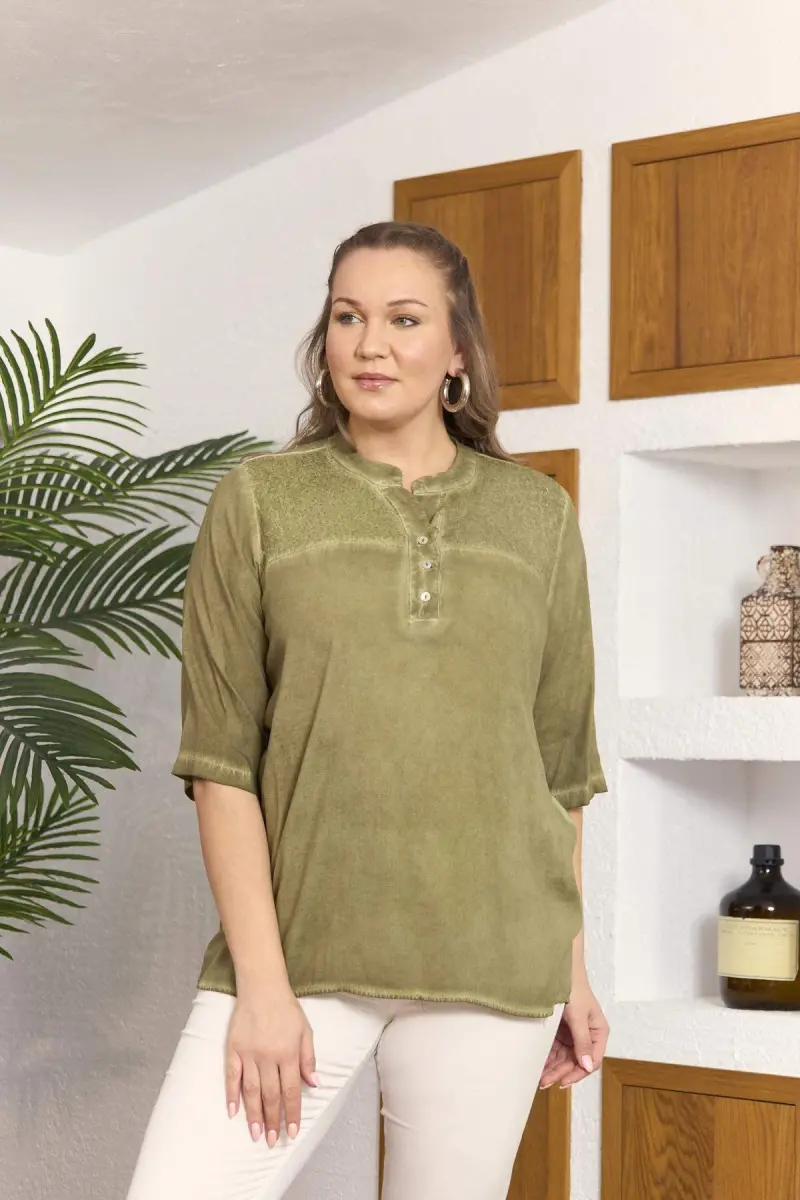 Enjoy comfort without compromising your style on hot summer days with the Plus Size Khaki Blouse with Sequin Collar Detail. This special design blouse creates a feeling of nothing on you all day long thanks to its 100% viscose fabric, while the lightness and breathable structure of the woven fabric eliminates the problem of sweating. The natural and sophisticated stance of the khaki color helps you to easily adapt to any environment, while the sequin details on the collar make the blouse stand out from the ordinary and make it eye-catching. The ideal length of the blouse, 75 cm, allows you to achieve perfect harmony with both trousers and skirts. Whether for daily use or for a special occasion, you can always look stylish and well-groomed with this blouse. Specially designed for women looking for plus sizes, this blouse perfectly hugs your body lines and gives you a confident stance. The 44 size blouse on the model will give you an idea about the stance and fit of the product. Considering that the model is 1.74 tall, has 115 cm bust, 88 cm waist and 120 cm hip measurements, you can choose the one that best suits your size. The Plus Size Khaki Blouse with Sequin Collar Detail, which will be an indispensable part of your summer wardrobe, will more than meet your expectations by offering both comfort and elegance together. This popular piece of our summer collection will complement your style and make you stand out in any environment. Remember, it is possible to feel better with the right clothes! This blouse is not just a piece of clothing, but also a style statement that gives you confidence and positive energy. While the soft texture of the fabric gently touches your skin, the stylish details will always make you feel special. The sequins on the collar catch the light, adding vitality to your face and making you look more energetic. The calming effect of the khaki color helps you feel peaceful and balanced throughout the day. Enjoy being both comfortable and stylish with this blouse and enjoy the summer to the fullest. Whether in your daily activities or at special events, you will always be remarkable and original with this blouse. This new member of your wardrobe will always inspire you and take your style one step further. The Plus Size Khaki Blouse with Sequin Collar Detail is not just a piece of clothing, but also a lifestyle. Choose this blouse to feel good and reflect your style, and make a difference.