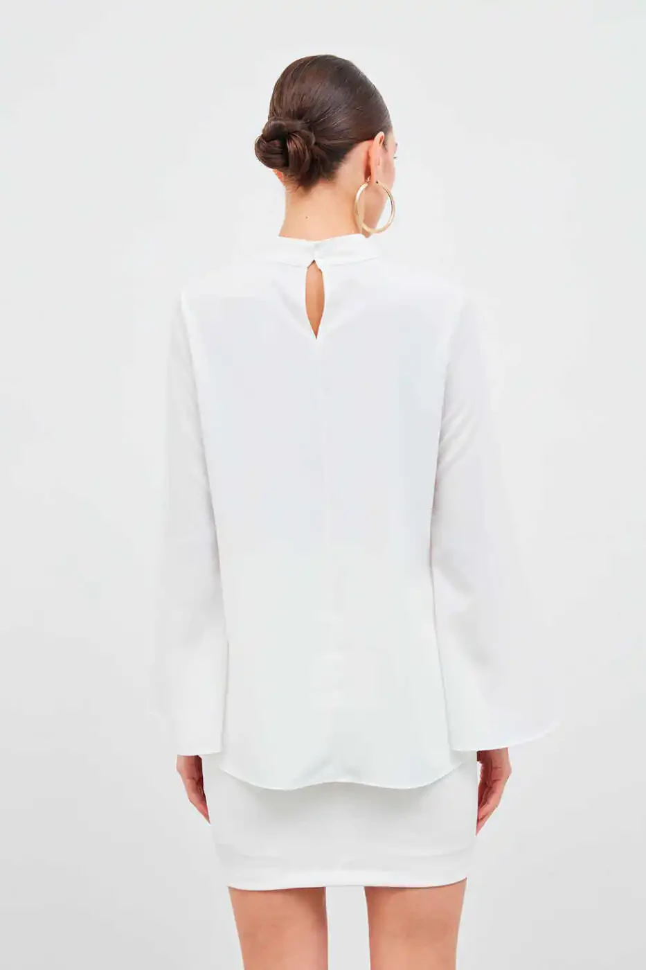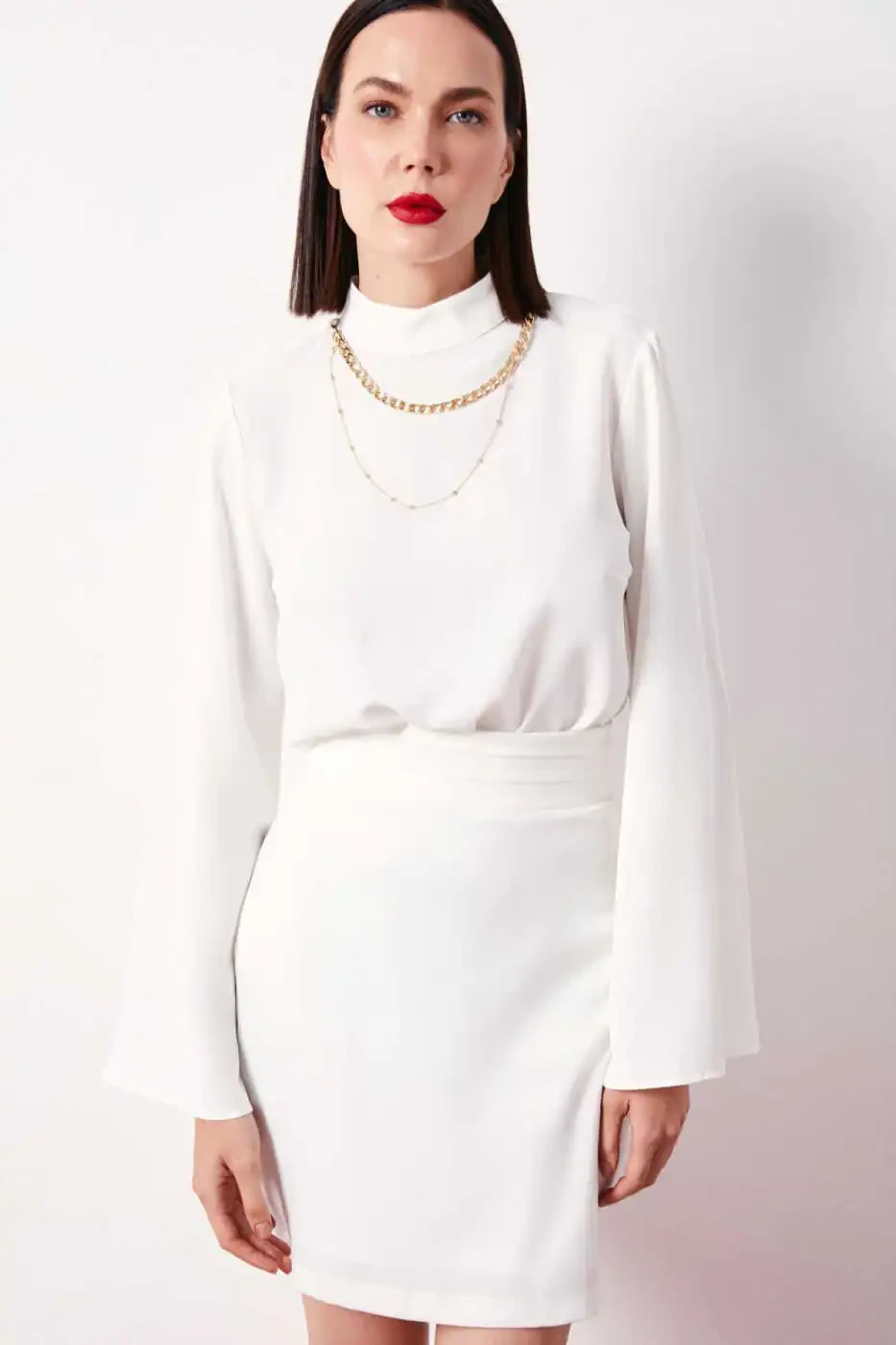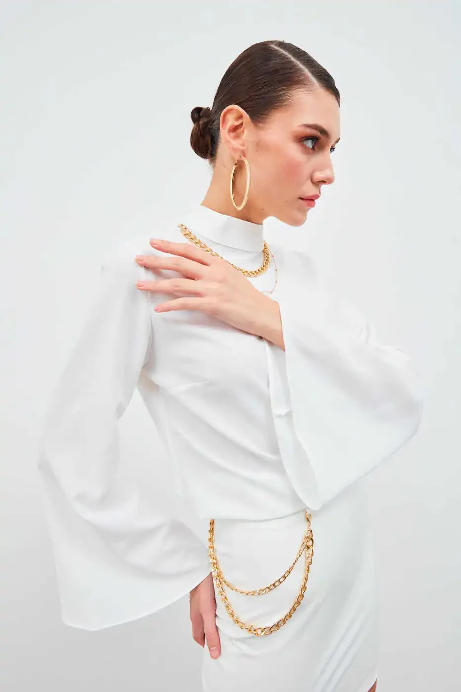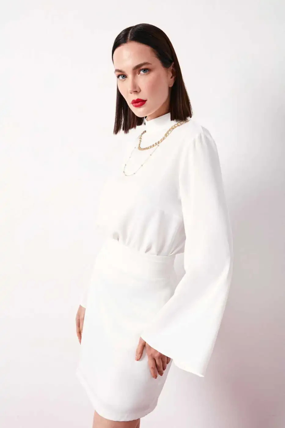 A perfect choice for a graceful and elegant look, the Collared Spanish Sleeve Blouse - Ecru will be an indispensable part of your wardrobe. This blouse, which you can wear comfortably even in the summer heat with its comfortable and breathable fabric, will complete your style on special occasions.