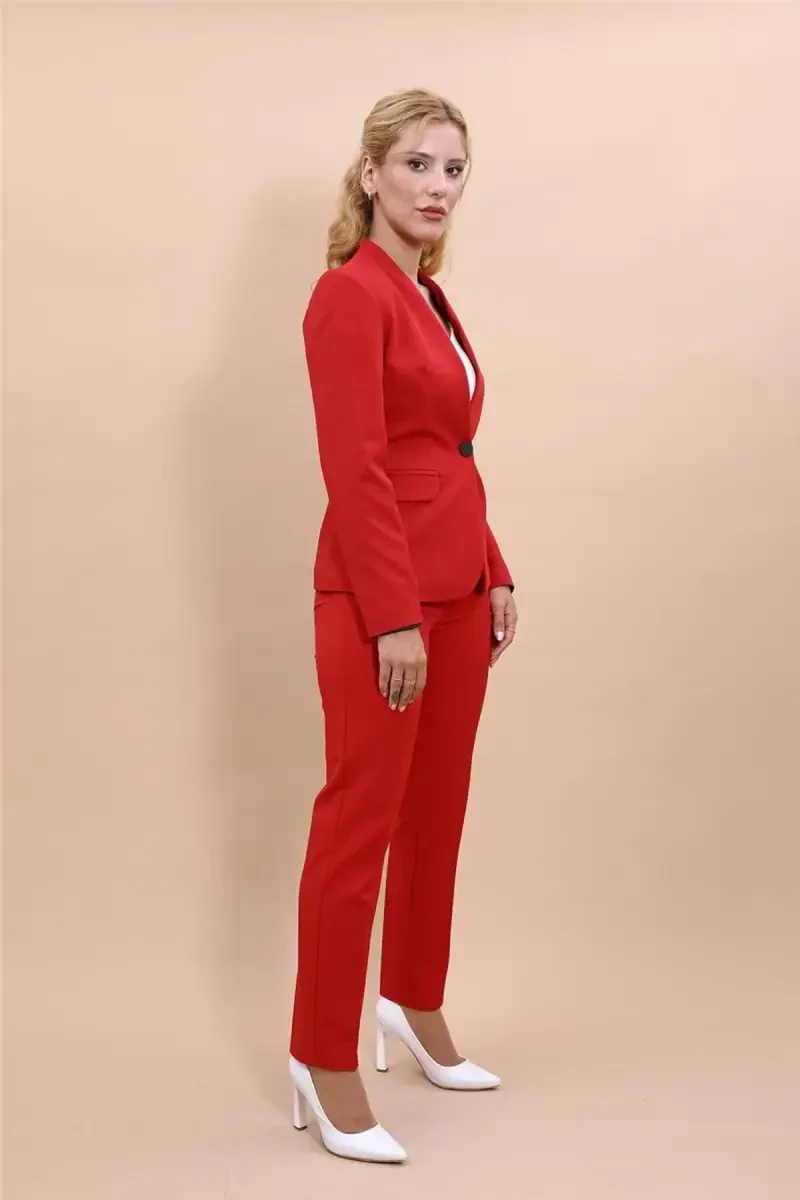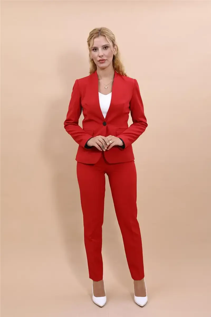 The Collarless Single Button Jacket & Straight Leg Pants Set designed by ÖNDER ÖZSOY is a special combination that offers elegance and comfort together. This set, which attracts attention with the energy of red, is an ideal option for both daily use and special occasions. This set, which is completely our own production, is produced with high quality materials and careful workmanship. The collarless jacket model offers a modern and minimalist look, while the straight leg pants create an elegant silhouette with its fitted cut. This suit is a candidate to be one of the indispensable pieces of your wardrobe. The decorative flap pockets and single button detail on the front of the jacket add a different dimension to the design, while the elastic waist and side zipper of the trousers make it easy to use. The vibrancy of the red color enlivens your combination and allows you to make a difference in any environment. Whether you attend a stylish invitation with heels or complete a daily combination with sneakers, this suit will always reflect your style in the best way. The cotton, polyester and elastane blend in the fabric provides both comfortable use and ensures the product's long life. Designed for women who seek elegance and comfort together, this suit is a versatile option that can be worn in all seasons. This suit, offered in different color options as well as red, aims to appeal to all tastes. You can reflect your style in the best way by choosing the one that suits your body. Our product offers a free return option within 15 days. In this way, you can easily return the product if you try it and do not like it. Do not miss this set that offers quality, elegance and affordable price together. This special design, which you can consider as a gift for yourself and your loved ones, is a candidate to be the most loved piece of your wardrobe.