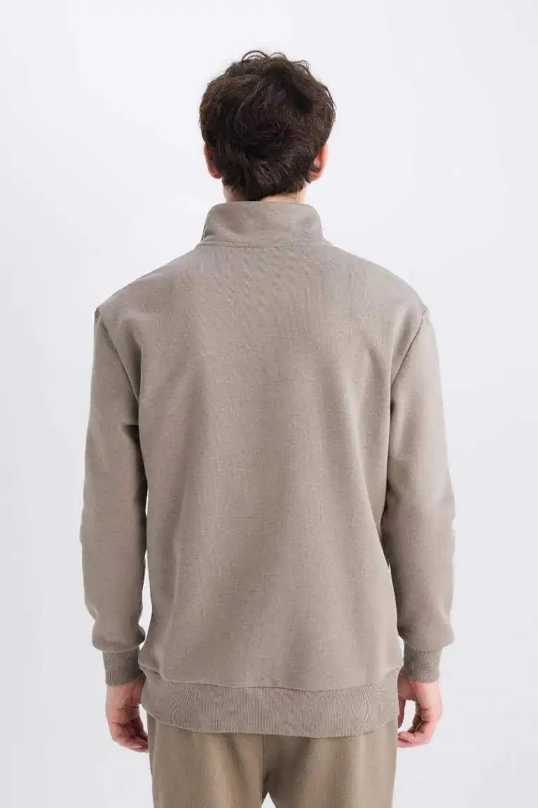 **Comfort Regular Fit Zippered High Collar Basic Plain Sweatshirt Khaki**