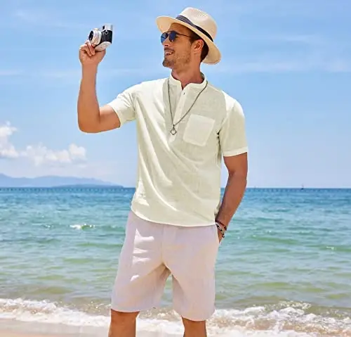 COOFANDY erkaklar qisqa yengli henley ko'ylak paxta zig'ir futbolkalar kundalik plyaj ustki kiyimi. Yozgi qulay kesim. Nafas oladigan, yumshoq va namlikni singdiruvchi mato. Kundalik uslub, qisqa yengli, henley yoqasi, tekis rang, yumaloq etak, standart kesim va ko'krak cho'ntagi bilan ajralib turadi. Plyaj, to'y, kundalik kiyim, ish, ta'til, ko'cha va boshqalar uchun mukammaldir. Mashinada sovuq suvda yuving va past haroratda quriting.