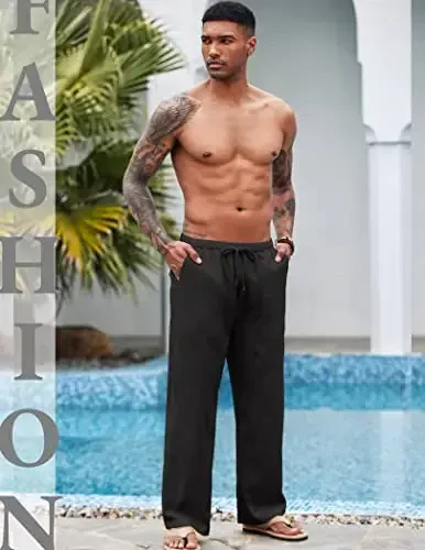COOFANDY Erkek Keten Pantolon: Yazlık, Rahat, Elastik Bel, İpli, Yoga