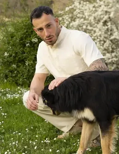 Pamuklu keten gömlek, henley yaka, kısa kollu, erkek, yazlık, rahat, şık, bohem, plaj, günlük giyim