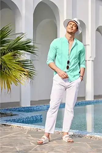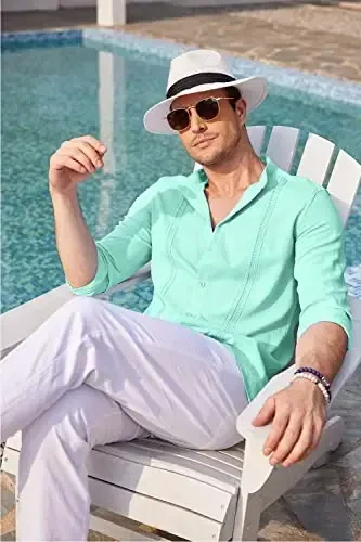 COOFANDY Men's Cuban Guayabera Shirts are a design that combines elegance and comfort, and is a candidate to be an indispensable part of the summer. These long-sleeved, button-down, and band-collar linen shirts are made from premium fabrics to keep you cool and comfortable in hot weather. You can easily prefer these shirts for daily use as well as special events, and they will add a unique touch to your style. With its embroidered details, vertical pleats and high-quality stitching, this shirt is both visually impressive and long-lasting. You can create different combinations by wearing it alone or over a t-shirt or tank top. COOFANDY Guayabera shirts are not just clothing, they also reflect a lifestyle. You can easily use these shirts on the beach, at weddings, on vacation, at parties or in daily life, and they will be one of the most popular pieces in your wardrobe. Thanks to its light and breathable fabric, it offers all-day comfort, while its stylish design allows you to stand out in any environment. It can be a wonderful gift option for yourself, your lover, your wife, your father or your son. These shirts, produced with COOFANDY quality, will help you reflect your style for many years. Guayabera shirts, which bring a new breath to men's fashion, offer a unique look by combining modern and traditional lines. Choose COOFANDY Men's Cuban Guayabera Shirts to enrich your wardrobe and highlight your style. Enjoy being both stylish and comfortable. These shirts are suitable for use in summer, spring and autumn. They can be easily combined with linen shorts, casual pants or shorts, creating a simple but stylish style. Always be stylish and comfortable with COOFANDY!
