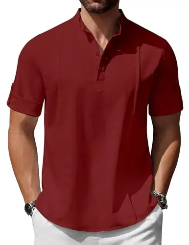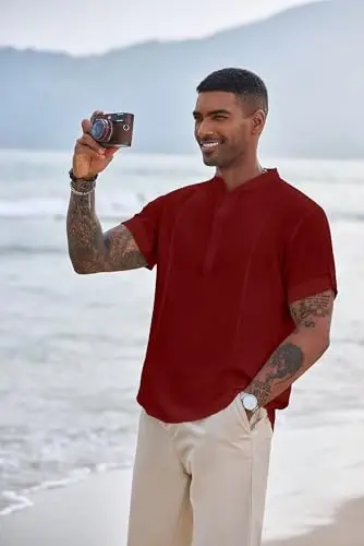 Refresh your summer wardrobe with COOFANDY Men's Henley T-Shirts! These short-sleeved, casual and stylish Henley shirts stand out with their band collar designs and summer, hippie style. Whether you're on the beach or doing your daily activities, these t-shirts will always offer you comfort and style. Made from high-quality materials, these t-shirts keep you cool in hot weather with their breathable and skin-friendly structure. The classic Henley collar and buttoned design give these t-shirts a timeless look. Thanks to its easy-to-combine structure, it allows you to create different styles. It is an ideal choice for men who are looking for elegance and comfort together.