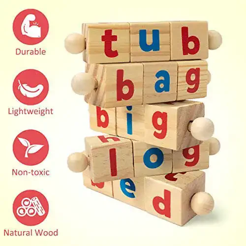 Wooden Spelling Toy: Includes a wood tray, 5 Handheld Sets of Rotating Blocks with 3-letter word movable blocks. Along with 48pcs site words flash card (24 pcs foldable word 2-in-1 cards, 24 pcs word cards). Appropriate for teaching very basic reading skills. Durable, Heavy Duty Material: The Wooden Letter Blocks and tray are made of natural wood which is durable and safe for kids. Larger-size wooden blocks which is prevent the risk of the kids swallowing. Spelling card are durable and easy to use, even in the classroom. The large, colorful print is colorful printed pattern with rounded corners and no sharp edges, smooth and burr-free. This spelling letters block are sturdy and everlasting even after long times using. Foldable Flash Cards of Site Words: Put the card into slot of the wooden tray, collapses the cards for covers the words shown in the picture, spelling out the words on the wooden alphabet blocks according to the prompt information of the site words flash card. Montessori educational toys helps toddlers develop strategic thinking in the brain, greatly develop memory skills. Attract Children's Attention: Toddler learning cards with colors companied by adorable illustrations more likely to attract children's attention, matching letter game keep your kids off of screens for a long period of time. At the same time you have enough free time to do whatever you want to do. Perfect Gift for Kids: These flashcards are durable and easy to use, even in the classroom. The large and not easily damaged. They can withstand the destructive power of children. colorful print is good. Educational toys is the best gift toys for boys and girls over 3 years old on birthdays, Christmas, Thanksgiving and other holidays.