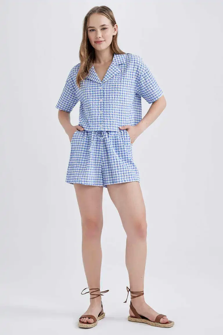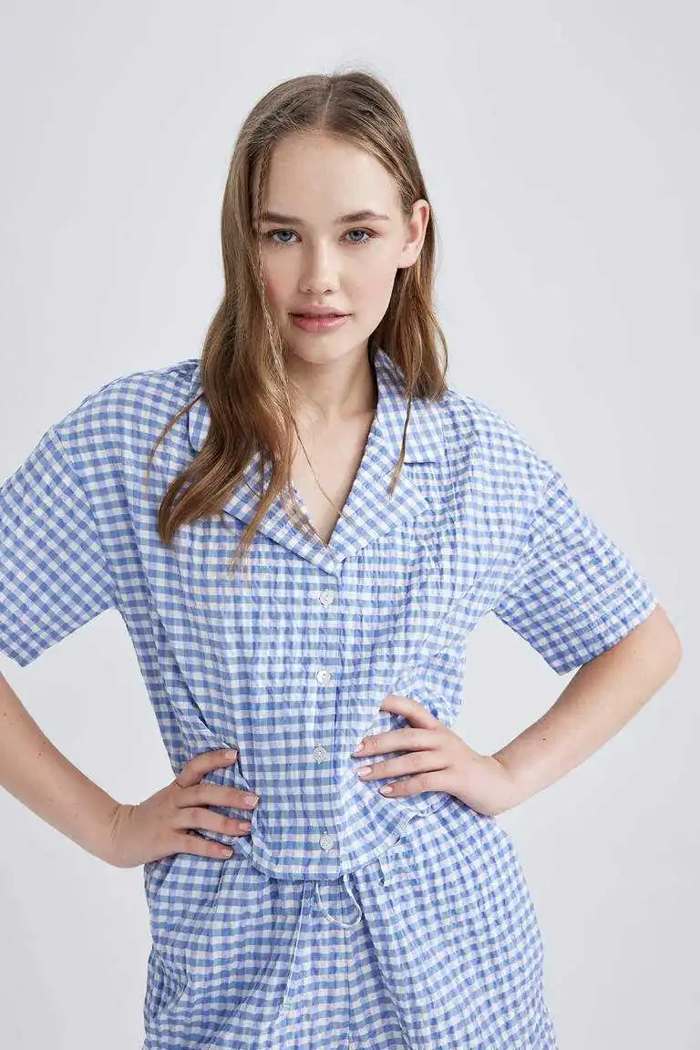 Coool Oversize Пижамная Рубашка с Воротником, Кринкл, Клетка, Короткий Рукав, Синий - это идеальное сочетание комфорта и стиля, которое сделает ваше время дома еще приятнее. Эта рубашка, которая обеспечивает комфорт благодаря своему свободному крою, отличается дышащей и мягкой тканью с эффектом кринкля. Ее клетчатый узор придает элегантность, а короткие рукава помогают вам оставаться в прохладе в летние месяцы. Ее синий цвет помогает дополнить ваш стиль, сочетаясь с любым видом нижнего белья и пижамных брюк.