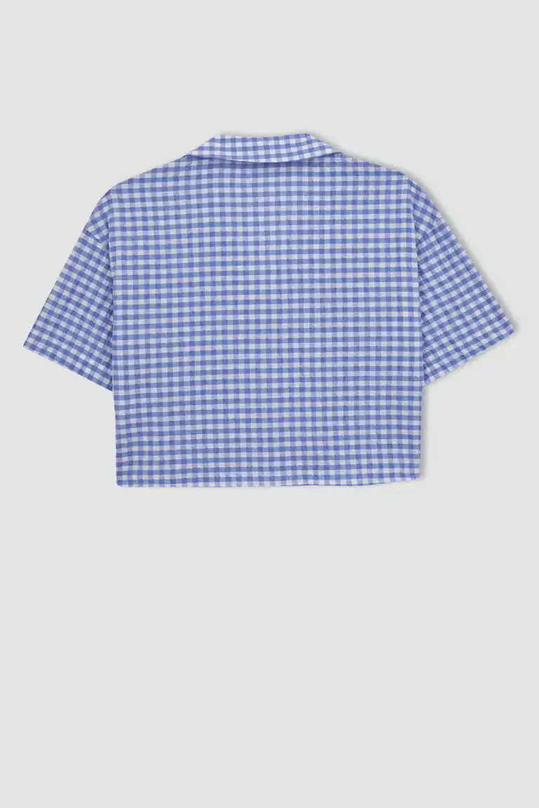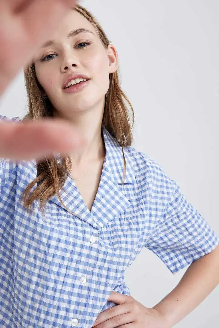 Преимущества Coool Oversize Пижамная Рубашка с Воротником, Кринкл, Клетка, Короткий Рукав, Синий:
