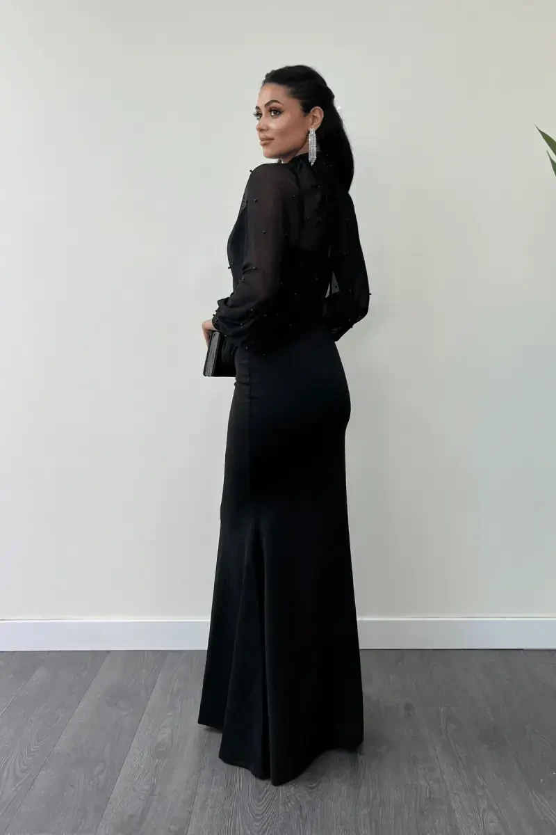 New Season Crepe Fabric Pearl Bolero Detailed Fishtail Dress is a candidate to be one of the most special pieces of your wardrobe. The light and draped structure of the crepe fabric offers comfortable use all day long, while not compromising the elegant appearance of the dress. The pearl-detailed bolero adds movement to the dress, while also providing an elegant touch. The bolero frames the shoulders and upper body nicely, while also balancing the décolletage. The fishtail cut creates a stylish silhouette that you can especially prefer at special events and celebrations. The black color of the dress can be easily combined with all kinds of accessories and shoes, allowing you to create different styles. Whether you get a classic look with heels or a more comfortable elegance with flats, this dress will make you feel special in every situation. The quality workmanship and materials used in the dress offer long-lasting use. The durability of the crepe fabric helps the dress maintain its shape, while the careful workmanship of the pearl details ensures that it retains its elegance for a long time. The dress is a versatile piece that will accompany you on your special days or in your daily elegance. Crepe Fabric Pearl Bolero Detailed Fishtail Dress is an option that will appeal to every woman with its modern and elegant design. The timeless elegance of black, the sparkle of pearl details and the feminine stance of the fishtail model make this dress unique. You can choose this dress to feel special and highlight your elegance. You can easily use this dress at weddings, engagements, graduations or special dinners, and it will make you stand out in any environment. This dress, which will be an indispensable part of your wardrobe, can be worn with pleasure for many years. The maintenance of the dress is also very easy. You can ensure long-lasting use by washing it on a delicate washing program or by dry cleaning. The need for ironing is also minimal, so you can always achieve a perfect look. Crepe Fabric Pearl Bolero Detailed Fishtail Dress is not just a garment, but also a style statement. Choose this dress to feel special and let your elegance speak, and dazzle in every environment.