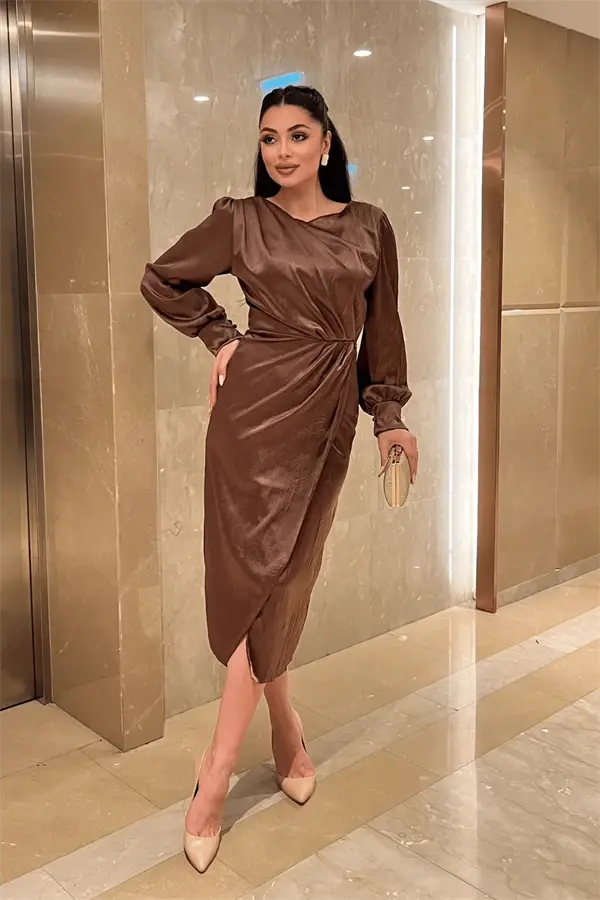 Experience elegance and comfort with the Crinkle Fabric Wrap Pencil Dress! This special design brown dress will be an indispensable part of your wardrobe with its modern and elegant look. The unique texture of the crinkle fabric adds movement and difference to the dress, while the wrap cut perfectly reveals your body lines. The pencil skirt model adds a professional and sophisticated touch to you.The 110 cm length of the dress from the shoulder makes it suitable for both daily use and special occasions thanks to its ideal length. The side zippered design allows you to put it on and take it off easily without sacrificing its stylish appearance. The light structure of the crinkle fabric ensures you feel comfortable all day long, while its non-stretch feature keeps its shape.Whether you make a stylish combination with heels or create a comfortable style with sneakers for daily use, the Crinkle Fabric Wrap Pencil Dress will help you reflect your style in any environment. The brown tone adapts to every skin tone and makes your combinations easier.The dress is a full fit, so it is recommended to choose your own size. The S/36 size on the model can give you an idea of how the dress will look on you. Remember, the best accessory of every outfit is your self-confidence. Feel special and let your style speak with the Crinkle Fabric Wrap Pencil Dress! The unique texture of the crinkle fabric and the elegance of the wrap cut distinguish this dress from others. You will dazzle with your elegance both in business life and on special occasions. The warm and natural tone of brown offers wearability in every season. You can easily match it with different colors while combining and reflect your own style.This dress is not just a garment, but also a style statement. Choose the Crinkle Fabric Wrap Pencil Dress to feel special and highlight your elegance. This dress, which contains care and quality in every detail, will be one of the most valuable pieces of your wardrobe.