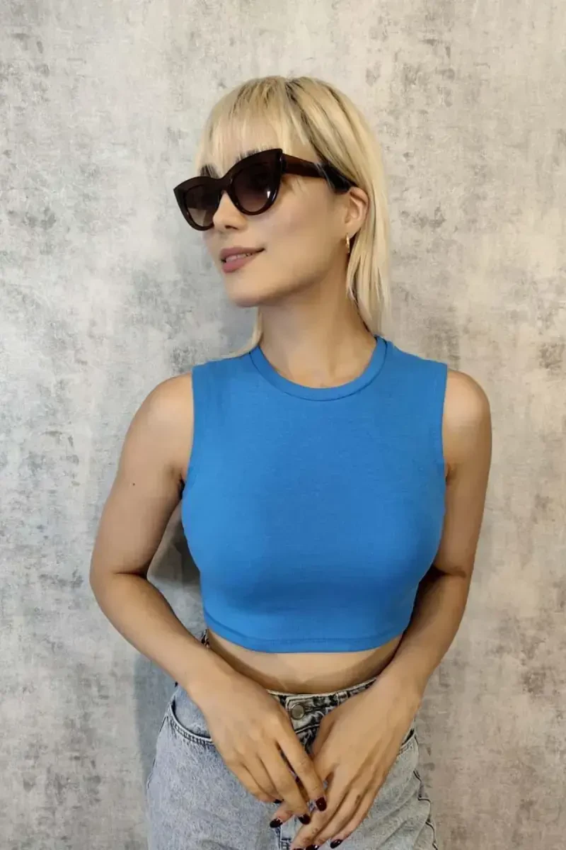 Crop top, saks mavisi, paxtali, qisqa kesim, qulay, kombinatsiyalanadigan, ayollar, bluzka, yozgi, chiroyli