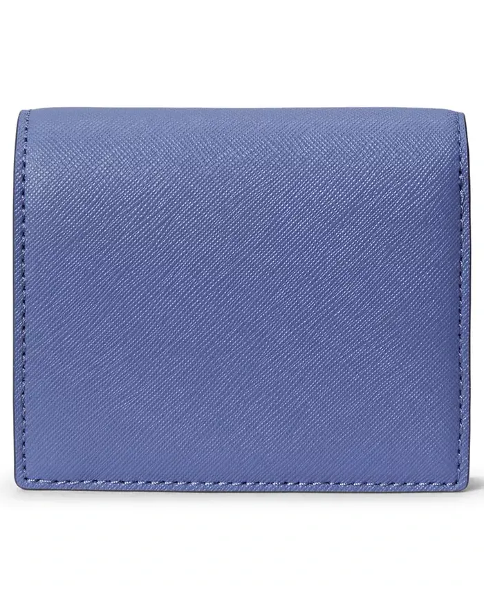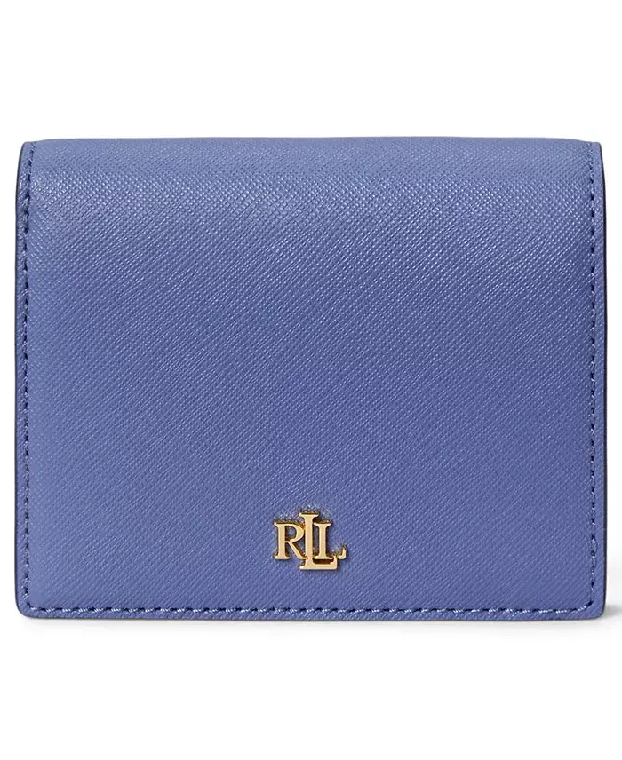 Crafted with crosshatch leather, this wallet by Lauren Ralph Lauren features a compact, bi-fold design with multiple card slots and pockets. Polished "LRL" hardware at the front adds signature style. 4-1/4"W x 3-1/2"H Snap closure Gold-tone hardware & logo plaque, interior zip coin pouch, bill slip & 5 card slots Leather; lining: polyester Professional leather clean Imported