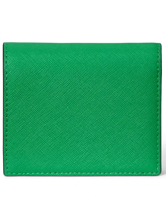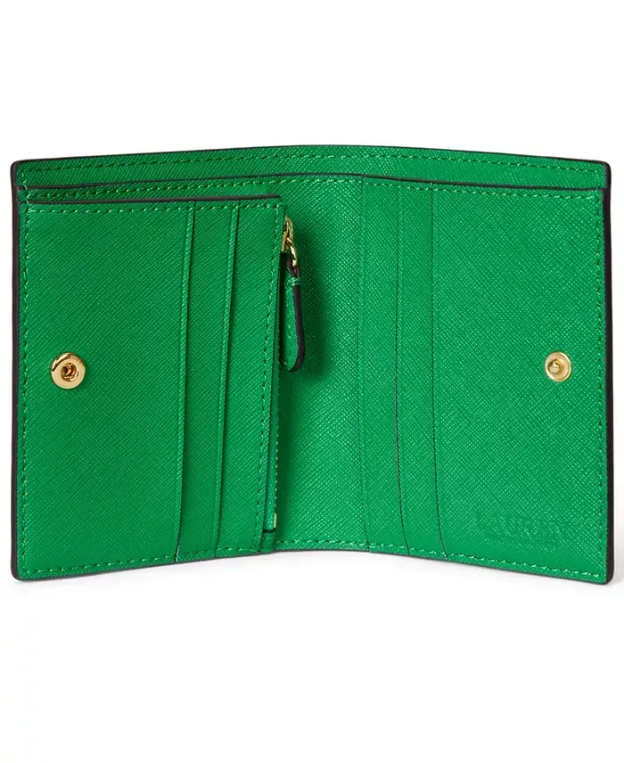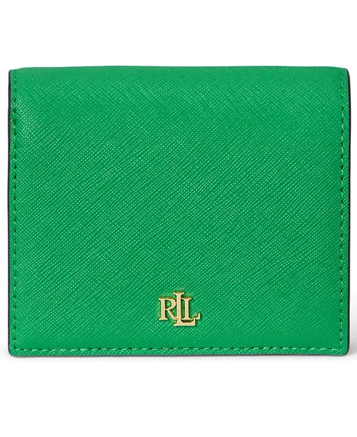 Crafted with crosshatch leather, this wallet by Lauren Ralph Lauren features a compact, bi-fold design with multiple card slots and pockets. Polished "LRL" hardware at the front adds signature style. 4-1/4"W x 3-1/2"H Snap closure Gold-tone hardware & logo plaque, interior zip coin pouch, bill slip & 5 card slots Leather; lining: polyester Professional leather clean Imported