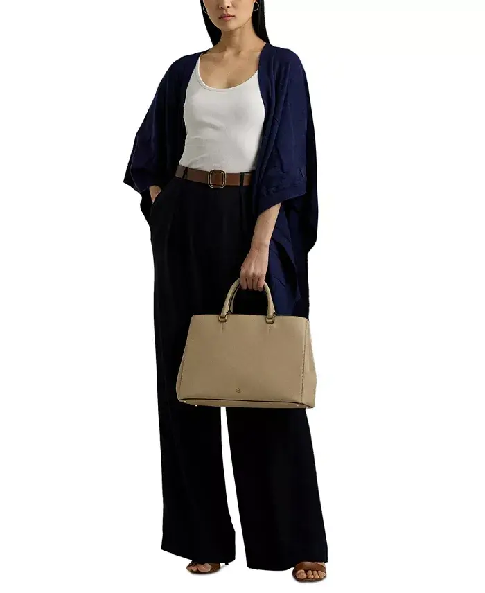 The Hanna Satchel, with its elegant and spacious silhouette from Ralph Lauren, is the perfect choice for carrying your essentials to work or for everyday errands. Multiple pockets allow you to store all your belongings. Designed with a refined look, its cross-grain leather construction and subtle "LRL" logo create a sophisticated atmosphere. It's a perfect accessory for a special occasion or a thoughtful gift. The large size measures 15-3/4" width x 10" height x 6-1/2" depth (width measured from the bottom of the bag) and weighs approximately 2.6 lbs. The silhouette is designed for a 5'9" model. It features 4-1/2" top handles and a detachable, adjustable strap of 16-3/4" in length. It has an open top construction, gold-toned hardware, and exterior pockets. Interior features include zipped and flat pockets. A dust bag is included. Made of leather with a polyester lining. Professional leather cleaning is recommended. Imported.