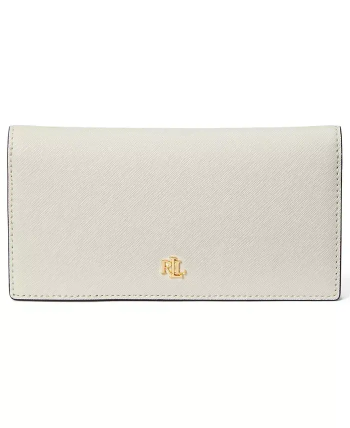 This slim wallet is crafted from Crosshatch saffiano leather and features multiple pockets for ample storage. Perfect gift for your next special occasion or holiday Measurements - mini sized bag, 6.75" W x 3.75" L x 0.75" D Closure - snapped Exterior detail - logo, zip pocket and gold-tone exterior hardware Interior detail - 15 card slots and four slip pockets Weight - 0.4 lbs Material: leather; trim: polyurethane; lining: polyester Wipe clean Imported