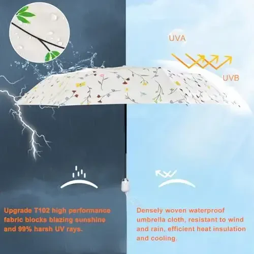 Cuby UV Sun Umbrella is designed to accompany you in both sunny and rainy weather with its compact and practical design. This umbrella stands out not only with its stylish appearance but also with the superior protection features it offers. Its specially designed fiberglass frame provides wind resistance, while its high-density and waterproof fabric keeps you dry in the rain. Its most remarkable feature is its special anti-UV coating that protects your skin from harmful UV rays by 99.9%. Cuby UV Sun Umbrella is an ideal choice for those with sensitive skin. Whether you want to protect yourself from the sun on hot summer days or avoid getting wet in rainy weather, this umbrella provides reliable protection in all weather conditions. The one-touch opening and closing feature offers practical use. Simply press a button to open or close the umbrella. After closing, you can further shrink the umbrella by applying force to the head and tail, which makes it easier to carry. When folded, this umbrella is only 27 cm in size, making it easy to carry in your bag or backpack. It weighs only 357 grams, which prevents it from adding weight when you carry it with you. Cuby UV Sun Umbrella is an ideal accessory to accompany you on your travels, daily tasks, or outdoor activities. This umbrella not only is functional but also has a stylish design. It complements every combination with its elegant and eye-catching appearance. Additionally, the umbrella comes with a special storage bag for easy storage. This bag helps keep your umbrella clean and tidy while also providing protection during transport. Cuby UV Sun Umbrella is a perfect gift option for your girlfriend, mother, wife, daughter, sister, colleagues, grandmother, parents, and loved ones. It is a great way to make them happy on special occasions such as Christmas, Thanksgiving, Mother's Day, and Children's Day. At Cuby, we are committed to providing the highest quality products and the best service. If you have any questions about our products, please do not hesitate to contact us. We will respond to you in a timely manner and help you solve any problems you encounter. We are constantly improving our products based on your suggestions. It comes with a 90-day manufacturer's warranty after purchase. Thank you for your support and trust. Stay safe and stylish in all weather conditions with Cuby UV Sun Umbrella!