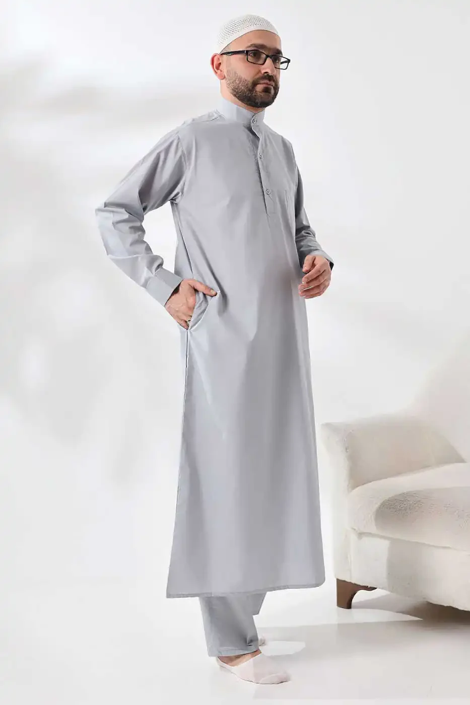 **Kulrang Chinor Dagron Matoli Erkaklar uchun Hajj Umra Kiyim Ihrom Toʻplami****Matoning Xususiyatlari:*** Yuqori sifatli Dagron matosidan tayyorlangan.* Yupqa toʻqilgan, nafas oladigan va qulay.* Burishish va ifloslanishga chidamli.* Oson yuvish va dazmollash mumkin.**Dizayn Xususiyatlari:*** Anʼanaviy ihrom modeli asosida ishlab chiqilgan.* Uzun yengli, tek qatlam.* Bel qismida sozlanuvchi bogʻlovchi bor.* Ikki dona yonbosh choʻntagi va ikki dona yuqori choʻntagiga ega.* Ikki qismdan iborat: Ihrom va libosi.* Libosi ipakka oʻxshash yumshoq matodan ishlab chiqilgan.**Asosiy Xususiyatlari:*** Qulay va shirin tanlovdir.* Haj va umra kabi diniy ibodatlar uchun juda mos.* Uzoq vaqt foydalanish uchun bardoshli.* Oson tozalanadi va parvarish talab qilmaydi.* Arzon narxda.**Foydalanish Sohalari:*** Haj va umra ibodatlari* Boshqa diniy marosimlar* Kundalik kiyim uchun qulay va shirin**Oʻlchovlar:**Ihrom:* Uzunligi: 135 sm* Koʻkrak qafasi kengligi: 58 sm* Yeng uzunligi: 60 smLibosi:* Uzunligi: 220 sm* Kengligi: 120 sm**Eslatma:** Ihrom va libosi alohida-alohida ham sotiladi.