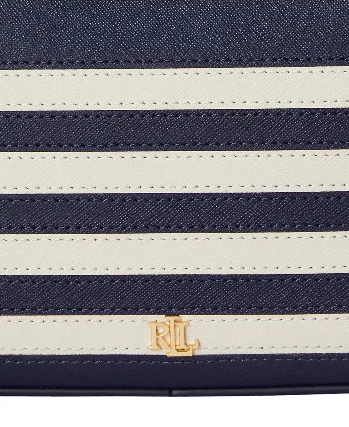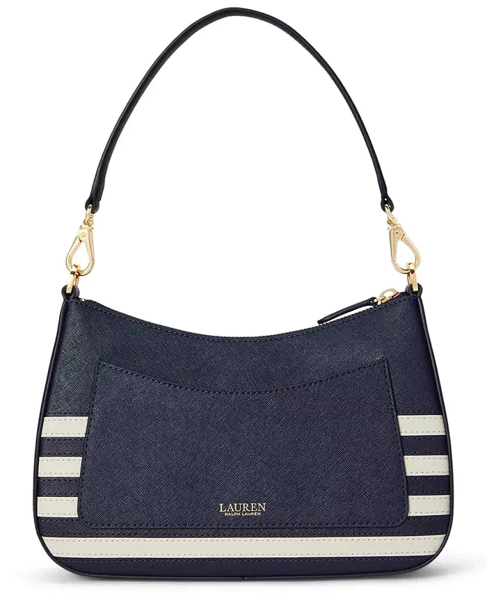 With its curved silhouette and luxurious crosshatch leather, the Danni slim shoulder bag by Ralph Lauren is a sophisticated accessory that you'll reach for again and again. Perfect for elevating your next special occasion look or as a thoughtful holiday gift. Small sized bag; 10"W x 7-1/2"H x 2"D (width is measured across the bottom of the bag); 0.98 lbs. approx. weight Silhouette is based off 5'9" model 8-3/4"L handle; 21-1/4"L removable, adjustable strap Zip-top closure Gold-tone hardware & exterior slip pocket Interior zip & slip pockets Dust bag included Leather; lining: polyester Professionally clean Imported