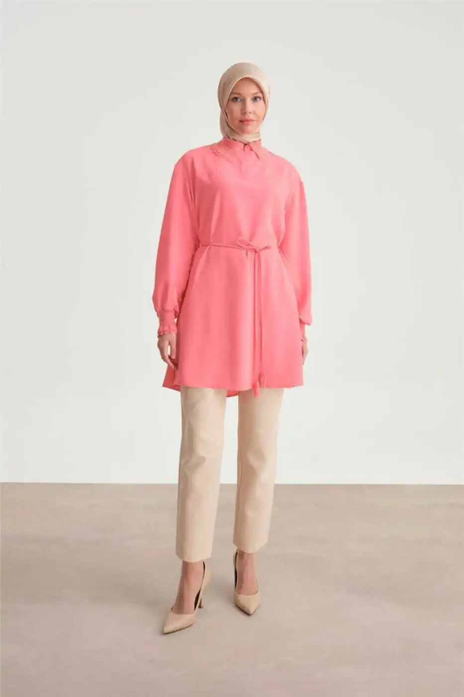Özellikle tesettür giyim koleksiyonu için tasarlanan bu tunik, şıklığı ve tesettür prensiplerini bir arada sunar. Kuşak detayı bel bölgesini vurgulayarak feminen bir siluet oluşturur. Hakim yaka tasarımı ile zarif bir görünüm kazandırırken, düz renk seçeneğiyle kolayca kombinlenebilir. Dokuma kumaş tipi dayanıklılığı arttırarak uzun süreli kullanım imkanı tanır. Regular boy kesimi sayesinde farklı vücut tiplerine uyum sağlayarak ideal bir oturuş sunar.