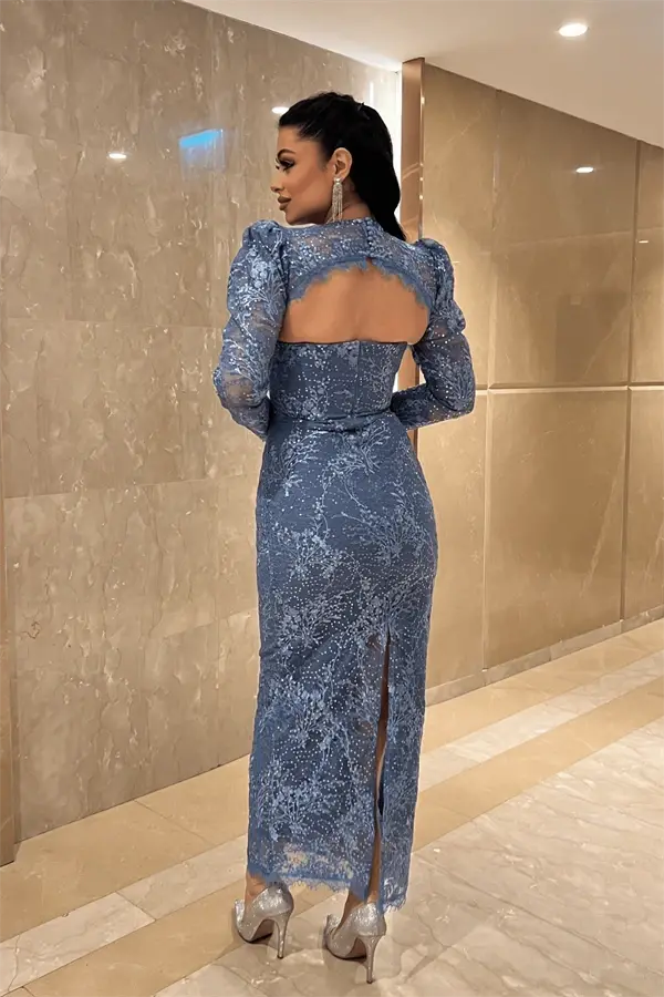 Dantelli Pullu Kumaş Sırt Detaylı Kalem Elbise - İNDİGO MAVİ