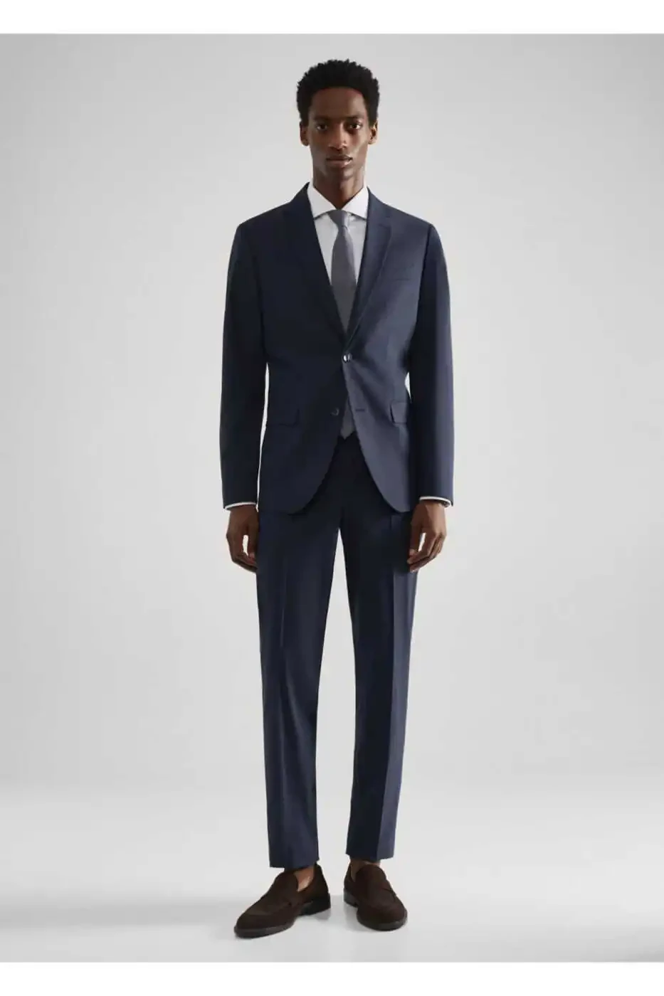 **Slim Fit Wool Suit**Indulge in modern style with this sleek suit that will elevate your wardrobe. Its slim fit and premium wool-blend fabric create a tailored silhouette that flatters your body.**Features:*** Slim fit* Recycled wool and polyester blend fabric* Notch lapel* Buttoned long sleeves* Breast welt pocket* Two front flap pockets* Two interior pockets* Double vents* Buttoned and lined* Wrinkle-resistant and easy-care fabric* Thermoregulation to maintain body temperature* Slimmer cut compared to Regular Fit* Model is 187 cm tall and wears size 50**Materials:*** 41% wool* 40% recycled polyester* 14% polyester* 5% elastane* Lining: 52% viscose, 48% polyester**Measurements:*** Side seam length: 49.7 cm* Back length: 79.1 cm**Care Instructions:*** Do not wash* Do not bleach* Iron at max. 110°C* Dry clean with perchlorethylene* Do not tumble dry**Styling Tips:*** Sweater* T-shirt* Dress shirt and tieFor those who prefer a classic cut, this suit is the perfect choice. It conforms to your body without being too revealing. Available in various styles such as double-breasted, linen, wool, and regular, Slim Fit suits offer both formal and casual versatility.
