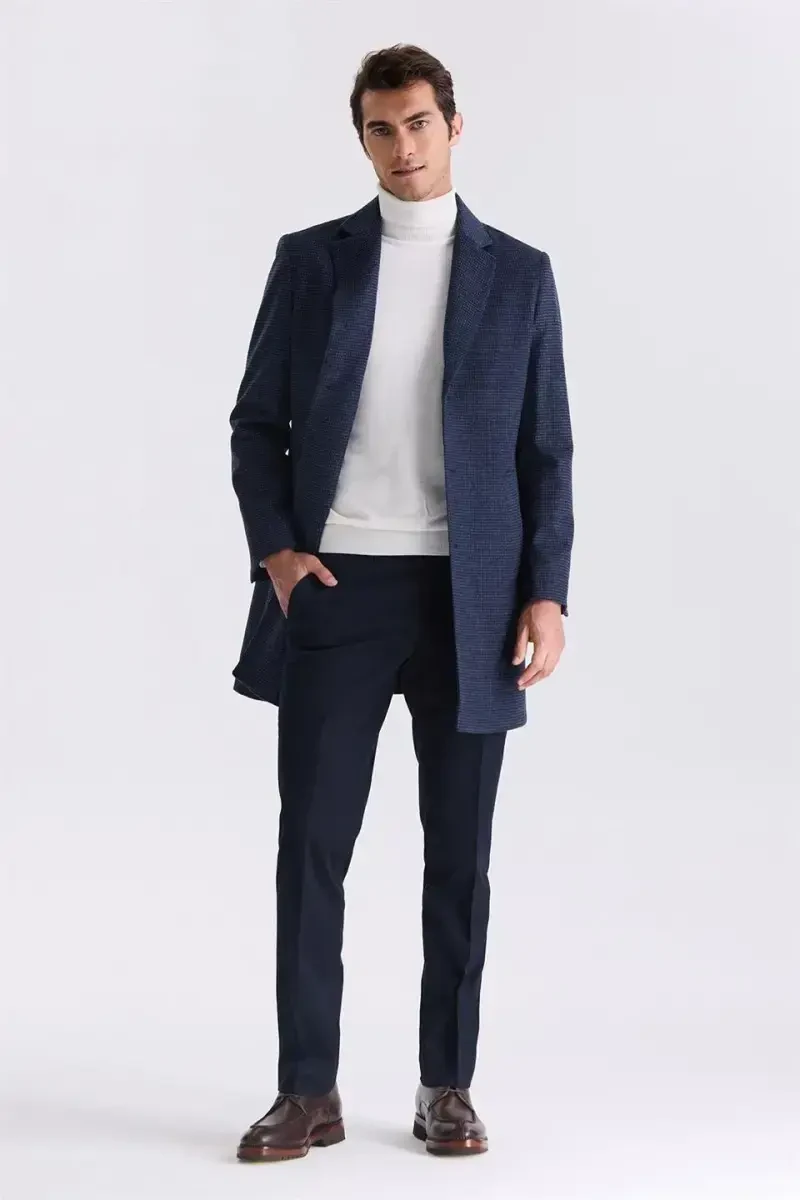 **Navy Blue Comfort Fit Mono Collar Patterned Plaid Cashmere Coat**Combining the elegance of navy blue with the chicness of plaid patterns, this coat offers both warmth and durability with its %60 wool and %40 polyester blend fabric. Its Comfort Fit silhouette sits comfortably on your body while its mono collar adds a modern touch.**Features:*** %60 Wool, %40 Polyester* Comfort Fit fit* Mono collar* Plaid pattern* Navy blue color**Model Measurements:*** Height: 187 cm* Weight: 78 kg* Shoulders: 120 cm* Chest: 100 cm**Model Size:** 50
