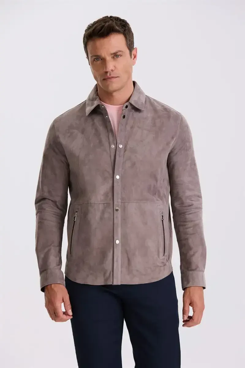 Dark Grey Comfort Fit Suede Jacket with Shirt Collar Studs: Style and Luxury