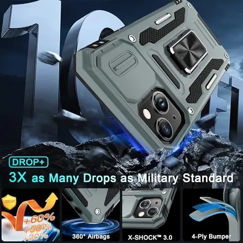 Armor Case with sliding camera cover specially designed for iPhone 14 PLUS-6.7 Inch (2022 released). NOT fit for other device! The precise cut out fits each button,camera,speakers and ports precisely, easy to press and access Military Grade Protection: Double layer shockproof case made by TPU+PC.This multi-layer cushion structure provide additional shock absorption protection.Certified by the Military Standard,survived over 8,000+ drop tests from up to 8FT!The flexible TPU interior absorbs impacts from inside.In addition,exterior with four reinforced corners can effectively absorb the impact of falling Camera and Screen Protection: Sliding camera cover protect the phone case camera lens from getting scratched and scuffed.Subtly enhanced 1.8 mm screen lips and glass screen protector provide the screen extra and comprehensive protection.Ensuring every aspect of your phone is protected with uniquely Magnetic Ring Kickstand: Newly upgraded multi-function case built-in ring kickstand and metal patch.Rotating ring provide two stand modes for vertical horizontal viewing,so it can be used as ring holder and release your hand when watching video.The Metal Patch back easily attach to magnetic car mount,very convenient during driving time for navigation.You will love how convenient it is with such powerful functions What's You Get: The package come with 1 pack phone case and 1 pack screen protector tempered glass. Notice: Due to the metal ring on the back,this case will NOT work with wireless charging function.