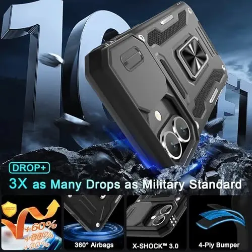 Armor Case with sliding camera cover specially designed for iPhone 16 Plus 6.7-Inch (2025 released). NOT fit for other device! The precise cut out fits each button,camera,speakers and ports precisely, easy to press and access Military Grade Protection: Double layer shockproof case made by TPU+PC.This multi-layer cushion structure provide additional shock absorption protection.Certified by the Military Standard,survived over 8,000+ drop tests from up to 8FT!The flexible TPU interior absorbs impacts from inside.In addition,exterior with four reinforced corners can effectively absorb the impact of falling Camera and Screen Protection: Sliding camera cover protect the phone case camera lens from getting scratched and scuffed.Subtly enhanced 1.8 mm screen lips and glass screen protector provide the screen extra and comprehensive protection.Ensuring every aspect of your phone is protected with uniquely Magnetic Ring Kickstand: Newly upgraded multi-function case built-in ring kickstand and metal patch.Rotating ring provide two stand modes for vertical horizontal viewing,so it can be used as ring holder and release your hand when watching video.The Metal Patch back easily attach to magnetic car mount,very convenient during driving time for navigation.You will love how convenient it is with such powerful functions What's You Get: The package come with 1 pack phone case and 1 pack screen protector tempered glass. Notice: Due to the metal ring on the back,this case will NOT work with wireless charging function.