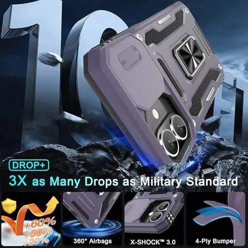 Armor Case with sliding camera cover specially designed for iPhone 16 Plus 6.7-Inch (2025 released). NOT fit for other device! The precise cut out fits each button,camera,speakers and ports precisely, easy to press and access Military Grade Protection: Double layer shockproof case made by TPU+PC.This multi-layer cushion structure provide additional shock absorption protection.Certified by the Military Standard,survived over 8,000+ drop tests from up to 8FT!The flexible TPU interior absorbs impacts from inside.In addition,exterior with four reinforced corners can effectively absorb the impact of falling Camera and Screen Protection: Sliding camera cover protect the phone case camera lens from getting scratched and scuffed.Subtly enhanced 1.8 mm screen lips and glass screen protector provide the screen extra and comprehensive protection.Ensuring every aspect of your phone is protected with uniquely Magnetic Ring Kickstand: Newly upgraded multi-function case built-in ring kickstand and metal patch.Rotating ring provide two stand modes for vertical horizontal viewing,so it can be used as ring holder and release your hand when watching video.The Metal Patch back easily attach to magnetic car mount,very convenient during driving time for navigation.You will love how convenient it is with such powerful functions What's You Get: The package come with 1 pack phone case and 1 pack screen protector tempered glass. Notice: Due to the metal ring on the back,this case will NOT work with wireless charging function.