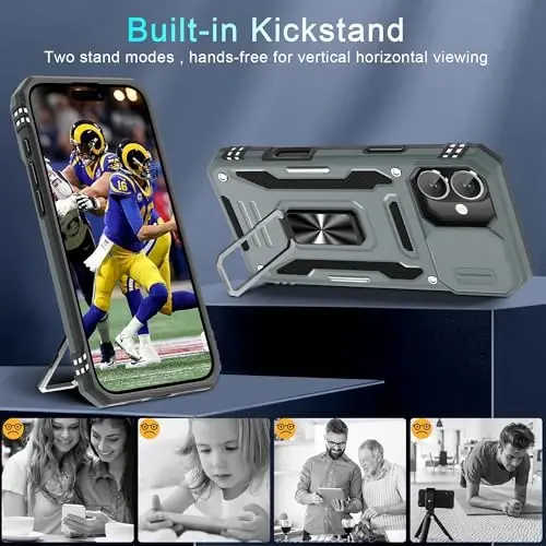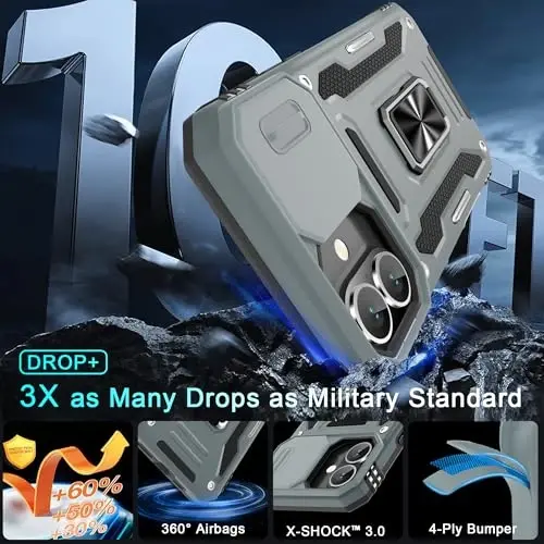 Armor Case with sliding camera cover specially designed for iPhone 16 Plus 6.7-Inch (2025 released). NOT fit for other device! The precise cut out fits each button,camera,speakers and ports precisely, easy to press and access Military Grade Protection: Double layer shockproof case made by TPU+PC.This multi-layer cushion structure provide additional shock absorption protection.Certified by the Military Standard,survived over 8,000+ drop tests from up to 8FT!The flexible TPU interior absorbs impacts from inside.In addition,exterior with four reinforced corners can effectively absorb the impact of falling Camera and Screen Protection: Sliding camera cover protect the phone case camera lens from getting scratched and scuffed.Subtly enhanced 1.8 mm screen lips and glass screen protector provide the screen extra and comprehensive protection.Ensuring every aspect of your phone is protected with uniquely Magnetic Ring Kickstand: Newly upgraded multi-function case built-in ring kickstand and metal patch.Rotating ring provide two stand modes for vertical horizontal viewing,so it can be used as ring holder and release your hand when watching video.The Metal Patch back easily attach to magnetic car mount,very convenient during driving time for navigation.You will love how convenient it is with such powerful functions What's You Get: The package come with 1 pack phone case and 1 pack screen protector tempered glass. Notice: Due to the metal ring on the back,this case will NOT work with wireless charging function.