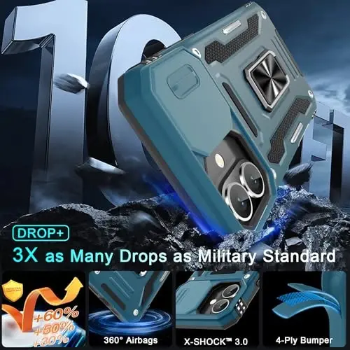 Armor Case with sliding camera cover specially designed for iPhone 16 Plus 6.7-Inch (2025 released). NOT fit for other device! The precise cut out fits each button,camera,speakers and ports precisely, easy to press and access Military Grade Protection: Double layer shockproof case made by TPU+PC.This multi-layer cushion structure provide additional shock absorption protection.Certified by the Military Standard,survived over 8,000+ drop tests from up to 8FT!The flexible TPU interior absorbs impacts from inside.In addition,exterior with four reinforced corners can effectively absorb the impact of falling Camera and Screen Protection: Sliding camera cover protect the phone case camera lens from getting scratched and scuffed.Subtly enhanced 1.8 mm screen lips and glass screen protector provide the screen extra and comprehensive protection.Ensuring every aspect of your phone is protected with uniquely Magnetic Ring Kickstand: Newly upgraded multi-function case built-in ring kickstand and metal patch.Rotating ring provide two stand modes for vertical horizontal viewing,so it can be used as ring holder and release your hand when watching video.The Metal Patch back easily attach to magnetic car mount,very convenient during driving time for navigation.You will love how convenient it is with such powerful functions What's You Get: The package come with 1 pack phone case and 1 pack screen protector tempered glass. Notice: Due to the metal ring on the back,this case will NOT work with wireless charging function.