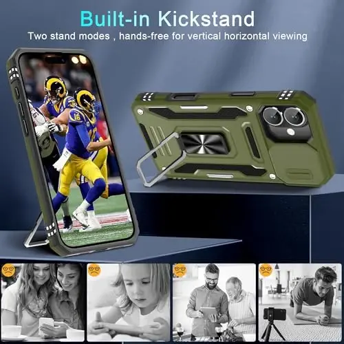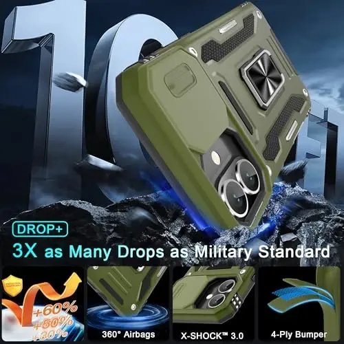 Armor Case with sliding camera cover specially designed for iPhone 16 Plus 6.7-Inch (2025 released). NOT fit for other device! The precise cut out fits each button,camera,speakers and ports precisely, easy to press and access Military Grade Protection: Double layer shockproof case made by TPU+PC.This multi-layer cushion structure provide additional shock absorption protection.Certified by the Military Standard,survived over 8,000+ drop tests from up to 8FT!The flexible TPU interior absorbs impacts from inside.In addition,exterior with four reinforced corners can effectively absorb the impact of falling Camera and Screen Protection: Sliding camera cover protect the phone case camera lens from getting scratched and scuffed.Subtly enhanced 1.8 mm screen lips and glass screen protector provide the screen extra and comprehensive protection.Ensuring every aspect of your phone is protected with uniquely Magnetic Ring Kickstand: Newly upgraded multi-function case built-in ring kickstand and metal patch.Rotating ring provide two stand modes for vertical horizontal viewing,so it can be used as ring holder and release your hand when watching video.The Metal Patch back easily attach to magnetic car mount,very convenient during driving time for navigation.You will love how convenient it is with such powerful functions What's You Get: The package come with 1 pack phone case and 1 pack screen protector tempered glass. Notice: Due to the metal ring on the back,this case will NOT work with wireless charging function.