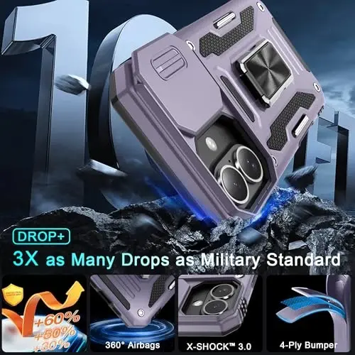 DEERLAMN iPhone 16 case offers a complete protection solution for your phone with its sliding camera cover, screen protectors, and rotating ring stand. This case is specifically designed for the iPhone 16 (6.1-inch, 2025 release) and is not compatible with other devices. With its precise cutouts, you can easily access all buttons, camera, speakers, and ports. Manufactured according to military-grade protection standards, this case offers superior impact resistance with its dual-layer TPU and PC materials. The multi-layer cushioning structure provides additional shock absorption, keeping your phone safe. It has successfully passed over 8000 drop tests from 8 meters. The flexible TPU inner part absorbs impacts from the inside, while the reinforced outer part with four corners reduces the impact of drops. The sliding camera cover protects your phone's camera lens from scratches and abrasions. Slightly raised 1.8 mm screen edges and the accompanying glass screen protectors provide extra and comprehensive protection to your screen. It uniquely protects every corner of your phone. The new generation multi-functional design combines with a built-in ring stand and metal piece for ease of use. The rotating ring offers two different stand modes for vertical and horizontal viewing, allowing you to free your hands while watching videos. The metal piece can be easily attached to magnetic car holders, making it ideal for navigation while driving. You will love how useful it is to have so many powerful features. Keep your phone both stylish and safe with the DEERLAMN iPhone 16 case. The case also has a striking appearance with its deep purple color.