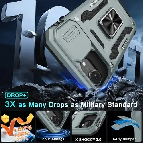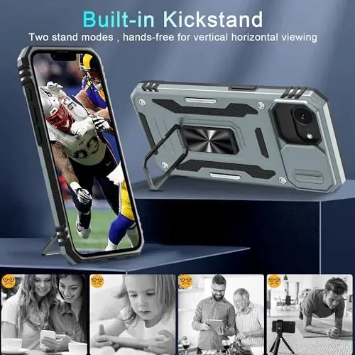 Armor Case with sliding camera cover specially designed for iPhone 16e 6.1-Inch (2025 Version), for iPhone 17e 6.1-Inch (2026 Version). NOT fit for other device! The precise cut out fits each button,camera,speakers and ports precisely, easy to press and access Military Grade Protection: Double layer shockproof case made by TPU+PC.This multi-layer cushion structure provide additional shock absorption protection.Certified by the Military Standard,survived over 8,000+ drop tests from up to 8FT!The flexible TPU interior absorbs impacts from inside.In addition,exterior with four reinforced corners can effectively absorb the impact of falling Camera and Screen Protection: Sliding camera cover protect the phone case camera lens from getting scratched and scuffed.Subtly enhanced 1.8 mm screen lips and glass screen protector provide the screen extra and comprehensive protection.Ensuring every aspect of your phone is protected with uniquely Magnetic Ring Kickstand: Newly upgraded multi-function case built-in ring kickstand and metal patch.Rotating ring provide two stand modes for vertical horizontal viewing,so it can be used as ring holder and release your hand when watching video.The Metal Patch back easily attach to magnetic car mount,very convenient during driving time for navigation.You will love how convenient it is with such powerful functions What's You Get: The package come with 1 pack phone case and 2 packs screen protectors tempered glass. Notice: Due to the metal ring on the back,this case will NOT work with wireless charging function.