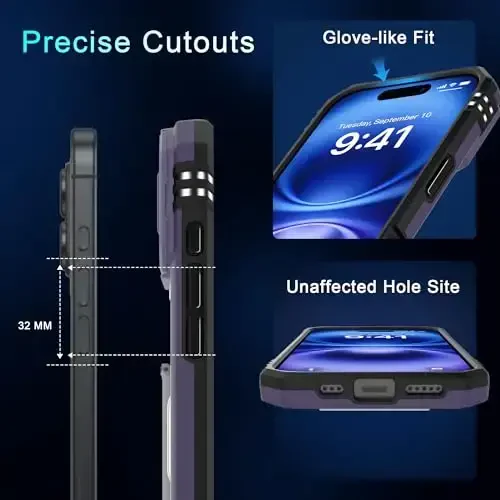 Бронированный чехол для телефона DEERLAMN, специально разработанный для iPhone 17 6,3 дюйма (модель 2025 года), с выдвижной крышкой камеры и 2 защитными пленками для экрана. Этот чехол тщательно защищает каждый угол вашего телефона, обеспечивая превосходную защиту от ударов, царапин и падений, возникающих при ежедневном использовании. Этот чехол, превосходящий военные стандарты защиты, изготовлен из комбинации материалов TPU и PC. Двухслойная структура максимально увеличивает поглощение ударов и обеспечивает безопасность вашего устройства. Точные вырезы чехла обеспечивают легкий доступ ко всем кнопкам, камерам, динамикам и портам. Выдвижная крышка камеры защищает объектив от царапин, а приподнятые края экрана и прилагаемые защитные пленки из закаленного стекла обеспечивают дополнительный уровень безопасности для вашего экрана. Встроенная магнитная кольцевая подставка позволяет расположить телефон горизонтально или вертикально, освобождая руки при просмотре видео или видеозвонках. Кроме того, металлическая пластина обеспечивает совместимость с магнитными автомобильными держателями, что обеспечивает большое удобство для навигации во время вождения. Чехол DEERLAMN не только обеспечивает защиту, но и дополняет стильный внешний вид вашего телефона. Этот чехол темно-фиолетового цвета привлекает внимание и придает вашему iPhone 17 как эстетичный вид, так и долговечную защиту. Помните, что из-за металлического кольца на задней панели этот чехол несовместим с функцией беспроводной зарядки.