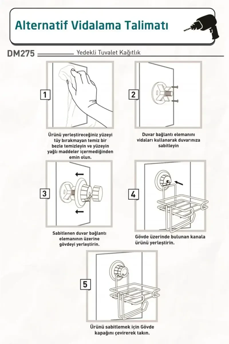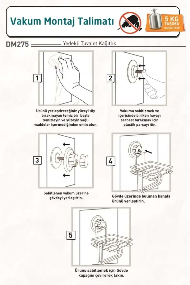 Тешиш, винт ва бурғу муаммоларингиздан халос бўлинг! DM275 вакуумли захирали ҳожатхона қоғоз тутгичи билан ҳаммомни тартибли ва замонавий қилишнинг энг амалий усулини кашф этинг. Текнотел Хром Уй Маҳсулотлари томонидан тақдим этилган бу замонавий матовый қора рангли ҳожатхона қоғоз тутгич текис ва ялтироқ деворларга, плёнкаларга зарар етказмасдан осонгина ўрнатилади. Кучли вакуум тизими туфайли ўта чидамли ва ишончлидир. 5 кг гача юк кўтара оладиган бу маҳсулот расмлардаги оддий йўриқномаларни бажариб осонгина ўрнатилади. Вакуум тизимидан мамнун бўлмасангиз, пакетдаги асбоб ёрдамида хоҳласангиз винтлаб ҳам ўрнатишингиз мумкин. Ўзбекистонда ўз категориясида экспорт бўйича етакчи фирма бўлган Текнотелдан воситачисиз, счёт-фактура билан харид қилиш имконияти билан 50 та давлатга экспорт қилувчи фирма сифатини уйингизга олиб киринг. Акция нархида сотилмоқда ва 10 донадан ортиқ захира мавжуд. Турли сотувчилар томонидан ҳам сотилаётган маҳсулот нарх, сотувчи рейтинги, етказиб бериш ҳолати ва акциялар каби мезонларга кўра сараланади. 15 кун ичида бепул қайтариш кафолати билан хотиржам харид қилишингиз мумкин. Экран туфайли ранг фарқи бўлиши мумкинлигини инобатга олинг. Бу бетакрор маҳсулот билан ҳаммомингизда замонавийлик ва амалиётни бирлаштиринг!