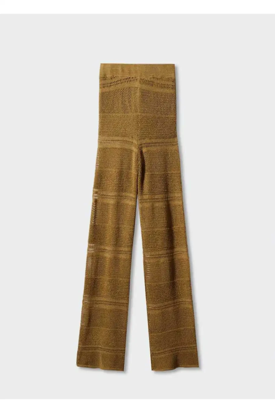 **Delikli Örgü Pantolon: Festival Şıklığınıza Rahat Bir Dokunuş**Bu şık ve rahat örgü pantolon, festival sezonunda göz kamaştırmanıza yardımcı olacak. Düz tasarımı ve yüksek beliyle rahat bir oturuş sunarken, delikli detayları bohem bir hava katıyor.**Süslü Özellikler:*** **Örme kumaş:** Yumuşaklık ve konfor için örme kumaş* **Düz tasarım:** Zahmetsiz bir siluet için düz tasarım* **Uzun model:** Tarzınızı uzatacak uzun model* **Yüksek bel:** Belinizi vurgulayacak yüksek bel* **Elastik bel:** Optimum konfor için elastik bel* **Kapamasız:** Kolay giyme ve çıkarma için kapamasız* **Delik parçalı:** Festival havası için delikli detaylar* **Total look:** Tek başına veya diğer festival parçalarıyla tamamlayarak kullanın**Sürdürülebilirlik:*** **Geri dönüştürülmüş polyester:** Çevre dostu ve sürdürülebilir bir seçim için geri dönüştürülmüş polyester kullanılmıştır.**Teknik Özellikler:*** **Kumaş:** %52 polyester, %48 viskoz* **Astar:** %95 polyester, %5 elastan* **İç bacak ölçüsü:** 77,0 cm* **Yan dikiş uzunluğu:** 110,5 cm**Bakım Talimatları:*** Maksimum 30°C'de elde yıkayın* Çamaşır suyu kullanmayın* Maksimum 110°C ile ütüleyin* Kuru temizleme yapmayın* Kurutma makinesinde kurutmayın